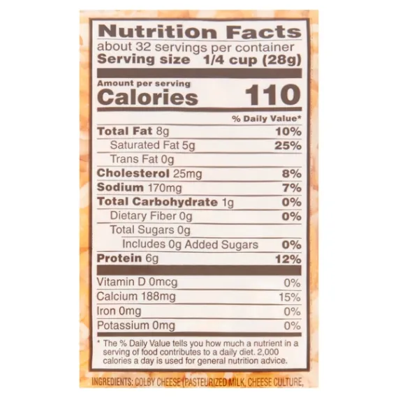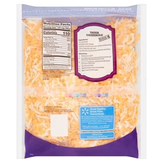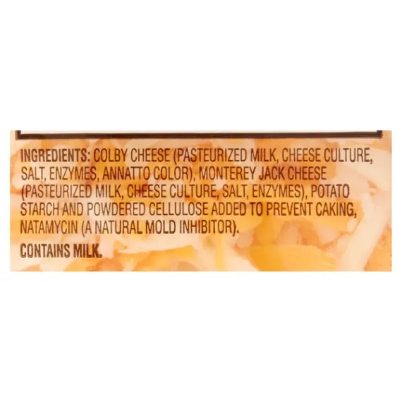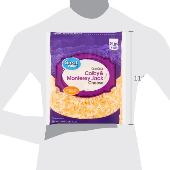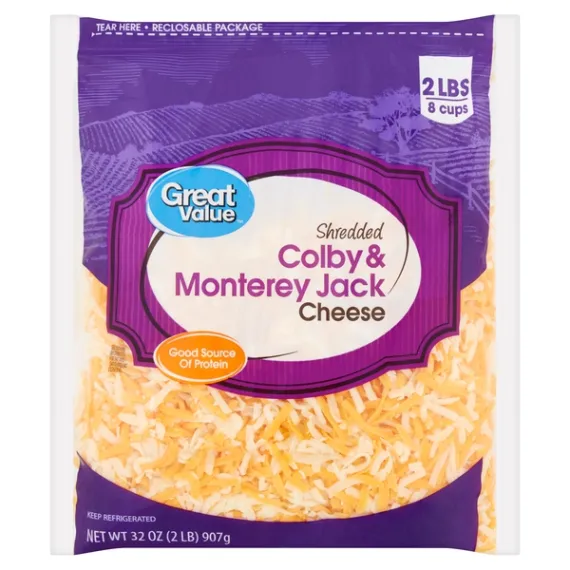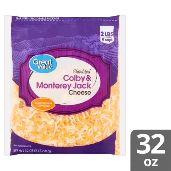 Details Ingredients COLBY AND MONTEREY JACK CHEESE (PASTEURIZED MILK, CHEESE CULTURE, SALT, ENZYMES, ANNATTO COLOR [ IN COLBY CHEESE]), POTATO ADDED TO PREVENT CAKING NATAMYCIN (A NATURAL MOLD INHIBITOR) Show more Product features Great Value Shredded Colby & Monterey Jack Cheese is packed with flavor and ready to use in lots of easy meals. This mix of sharp, tangy Colby and mild, melty Monterey Jack cheeses is an excellent topping for pizza, nachos, sandwiches, and salads, and is perfect to fill quesadillas and omelets. Each serving has 6 grams of protein to help you meet your nutrition needs while bringing a rich taste to your meals. Easily add fantastic flavor and pleasing texture to your favorite recipes and snacks anytime with Great Value Shredded Colby & Monterey Jack Cheese. Great Value products provide families with affordable, high quality grocery and household consumable options. With our wide range of product categories spanning grocery and household consumables, we offer you a variety of products for your family's needs. Our products are conveniently available online and in Walmart stores nationwide, allowing you to stock up and save money at the same time. 32oz (2lb) per container Resealable package 110 calories per serving Great source of calcium Special Features No artificial flavors Net Quantity of Content 32.0 X 0.25 cup