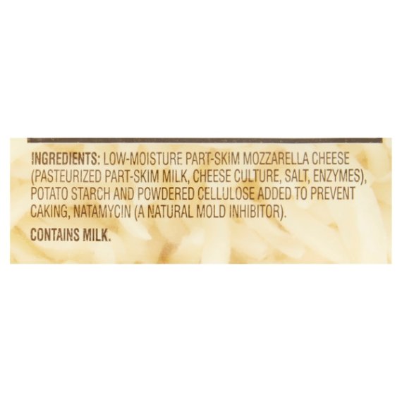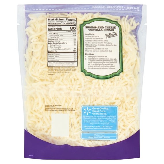 Details Ingredients LOW-MOISTURE PART-SKIM MOZZARELLA CHEESE (PASTEURIZED PART-SKIM MILK, CHEESE CULTURE, SALT, ENZYMES), POTATO STARCH AND POWDERED CELLULOSE ADDED TO PREVENT CAKING. NATAMYCIN (A NATURAL MOLD INHIBITOR). Show more Product features Great Value Shredded Low-Moisture Part-Skim Mozzarella Cheese will add creamy, flavorful goodness to your next homemade dish. This 32-ounce package of shredded Mozzarella has an easy-open seal that keeps cheese fresh. The next time you want to create a meal to impress, try a recipe for irresistible Mozzarella and Meatball Subs, Shrimp and Cheese Tortilla Pizzas, or bake up a homemade Italian Lasagna to wow your friends and family. Your next meal just got even better with Great Value Shredded Low-Moisture Part-Skim Mozzarella Cheese. Great Value products provide families with affordable, high quality grocery and household consumable options. With our wide range of product categories spanning grocery and household consumables, we offer you a variety of products for your family's needs. Our products are conveniently available online and in Walmart stores nationwide, allowing you to stock up and save money at the same time. Shredded low-moisture part-skim Mozzarella cheese Net weight: 2lb (8 cups) Reclosable package Good source of protein and calcium Gluten-free Special Features Approximately 8 cups Net Quantity of Content 32.0 X 0.25 cup