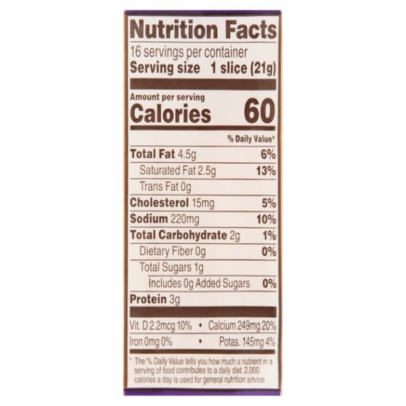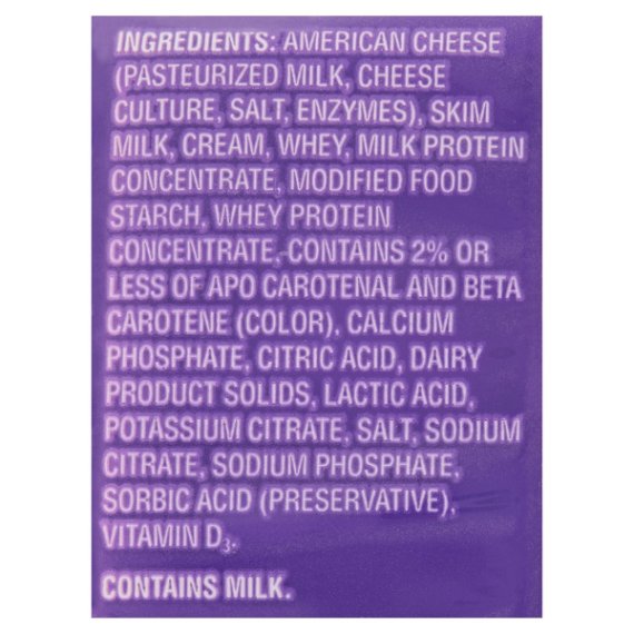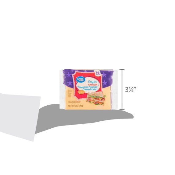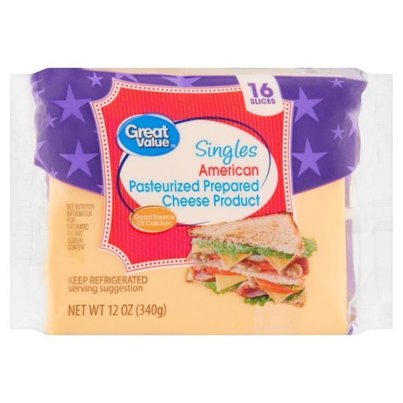 Details Ingredients CULTURED MILK, WATER, CREAM, WHEY, SODIUM CITRATE, MILK PROTEIN CONCENTRATE, MODIFIED FOOD STARCH, WHEY PROTEIN CONCENTRATE, CALCIUM PHOSPHATE, SALT, SORBIC ACID (PRESERVATIVE), SODIUM PHOSPHATE, CITRIC ACID, APO CAROTENAL AND BETA CAROTENE (COLOR), LACTIC ACID, ENZYMES, VITAMIN D3. Show more Product features Great Value Pasteurized Prepared Cheese Product is a gluten-free product that contains no artificial flavors in order to bring you a healthier way to enjoy your favorite cheese. It's rich in calcium for a welcome addition to a balanced diet. This American cheese product is available in a 12-oz package that contains 16 slices. Each one of these slices is individually wrapped so you can enjoy them one at a time on your sandwich, grilled cheese, cheeseburgers, pizza, pasta and more. It's made with pasteurized prepared cheese product and has a smooth texture that's ideal for both cooking with and snacking. Create a tasty snacking tray and serve this pasteurized cheese product with summer sausage and butter crisp crackers. Great Value Pasteurized Prepared American Singles Cheese Product, 12 oz: Rich in calcium No artificial flavors Made with pasteurized prepared cheese product Ideal on sandwiches Gluten-free pasteurized cheese product Individually wrapped cheese slices 16 slices Special Features No artificial flavors Net Quantity of Content 16 X 21 g