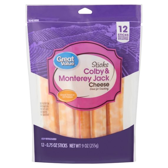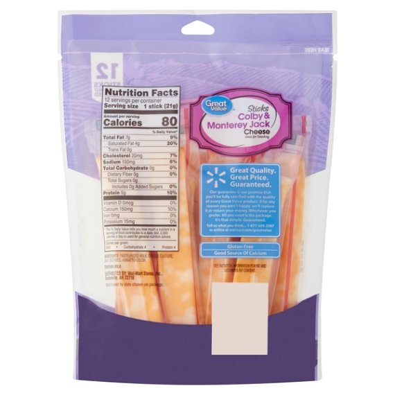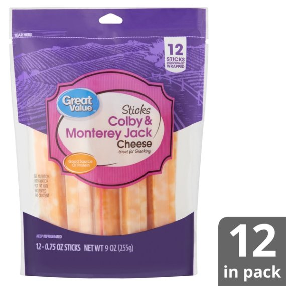 Details Ingredients PASTEURIZED MILK, CHEESE CULTURE, SALT, ENZYMES, ANNATTO COLOR. Product features Have a snack that makes you smile with Great Value Sticks Colby & Monterey Jack Cheese. These individually wrapped cheese sticks have only 80 tiny calories and 5 grams of protein per serving, making them an excellent protein-packed snack on the go. Throw a few into your lunch box on the way to work or school, or pack some on a road trip for when hunger strikes. Get creative in the kitchen and make homemade baked cheese sticks by coating them in egg wash, flour, and breadcrumbs and baking in the oven. Serve and enjoy with marinara sauce or ranch dip for a cravable appetizer that'll have your family coming back for seconds. Grab Great Value Sticks Colby & Monterey Jack Cheese and start experimenting today! Great Value products provide families with affordable, high quality grocery and household consumable options. With our wide range of product categories spanning grocery and household consumables, we offer you a variety of products for your family's needs. Our products are conveniently available online and in Walmart stores nationwide, allowing you to stock up and save money at the same time. Colby and Monterey Jack cheese 12 sticks individually wrapped Great for snacking Good source of protein and calcium Gluten-free Net Quantity of Content 12 X 21 g