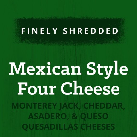 Details Ingredients Monterey Jack Cheese (Pasteurized Milk, Cheese Culture, Salt, Enzymes), Cheddar Cheese (Pasteurized Milk, Cheese Culture, Salt, Enzymes, Annatto [Color]), Asadero Cheese (Pasteurized Milk, Cheese Culture, Salt, Citric Acid, Enzymes), Queso Quesadilla Cheese (Pasteurized Milk, Cheese Culture, Salt, Vinegar, Citric Acid, Enzymes), Modified Cornstarch Added To Prevent Caking, Natamycin (A Natural Mold Inhibitor) Show more Product features Mealtime can be hard, especially when it comes to making something everyone agrees on. Use Kraft Shredded Mexican Style Four Cheese Blend to make something everyone will love, so you can spend time focused on each other and not worried about making everyone happy. Make taco night everyone's favorite night with this bag of shredded Mexican style cheese! This shredded Mexican style cheese blend adds authentic flavor to your family's favorite dishes, as it's made with an expert blend of Mexican style cheeses. This cheese comes pre-shredded for easy meal prep to be used in your familys favorite tacos, salads, quesadillas, and more. Each bag is resealable to help lock in flavor. Made with milk from cows raised without added rbST hormone. No significant difference has been shown between milk derived from rbST-treated and non-rbST treated cows. One 8 oz. bag of Kraft Shredded Mexican Style Four Cheese Blend Kraft Mexican Style Four Cheese Blend backed by years of cheese-making experience Every batch of Kraft Cheese starts with fresh milk for creamy flavor Say yes to the rich cheese taste you and your family will love Shredded cheese sprinkles evenly and melts easily Enhance your next meal with Kraft Shredded Mexican Style Four Cheese Blend Resealable bag helps lock in flavor Net Quantity of Content 8.0 X 1/4 cup (28g)