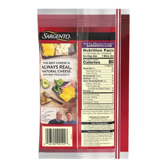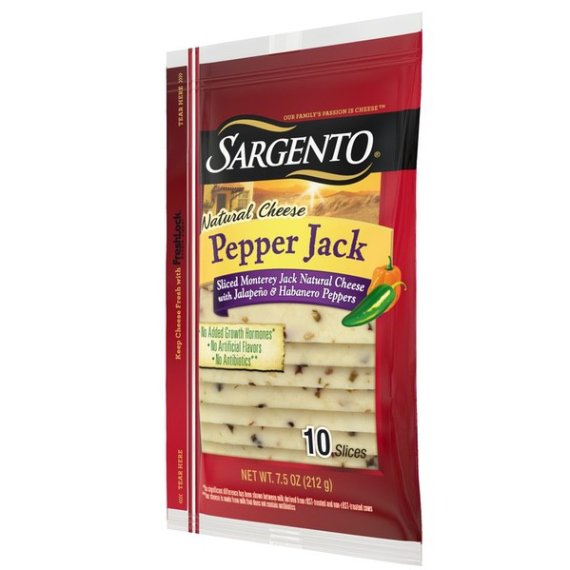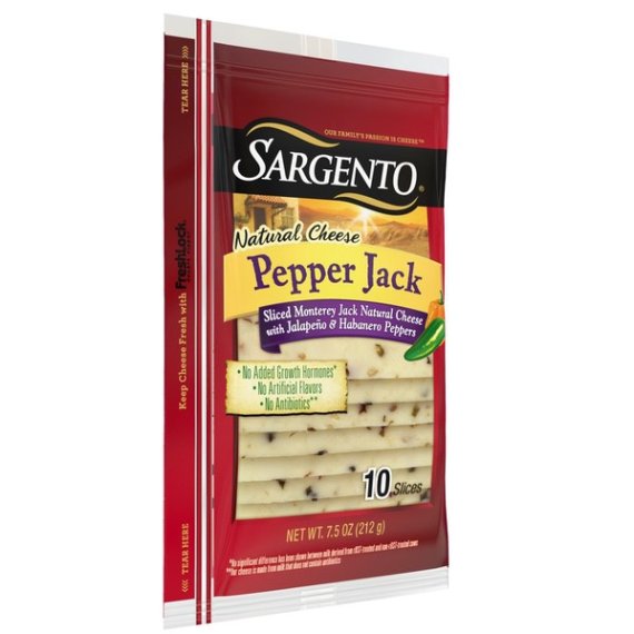 Details Ingredients Pasteurized Milk, Jalapeno Peppers, Cheese Culture, Salt, Habanero Peppers, Enzymes. Product features With a spicy, hot kick infused with a smooth, delicate finish, our sliced Monterey Jack cheese blended with habanero and jalapeno peppers provides the best of both ends of the flavor scale. The perfect addition to a turkey or roast beef sandwich, or atop crackers for a great afternoon snack. Sargento® Pepper Jack Cheese slices add a burst of heat to a turkey or roast beef sandwich and makes a great snack when served with crackers. This 7.5 oz. package comes with 10 slices of Pepper Jack cheese perfect for sandwiches or atop crackers. 100% Real, Natural Cheese uses simple ingredients like, Pasteurized Milk, Hot Peppers (Jalapeno Peppers, Habanero Peppers), Cheese Culture, Salt, Enzymes. Easy-open and -close Fresh-Lock® packaging keeps cheese fresh longer, but use within five days upon opening for maximum freshness. Our Family’s Passion Is Cheese™ Special Features Resealable Net Quantity of Content 10.0 X 21 g