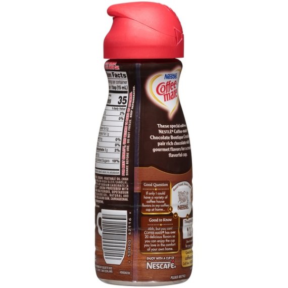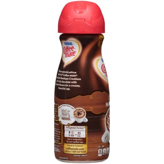 Details       Ingredients  Water, Sugar, Vegetable Oil (High Oleic Soybean and/or High Oleic Canola), and less than 2% of Micellar Casein (a Milk Derivative)**, Cocoa Processed with Alkali, Mono- and Diglycerides, Dipotassium Phosphate, Natural and Artificial Flavor, Cellulose Gel, Cellulose Gum, Carrageenan.**Not a Source of Lactose.      Show more      Product features  Coffee mate Cafe Mocha flavor non-dairy coffee creamer is part of the Coffee House line of gourmet-inspired flavors perfect for every day. Decadent and rich, this lactose-free and cholesterol free creamer will tantalize your taste buds. Splashes of rich, dark mocha blend harmoniously with bold coffee notes for an incredible flavor experience. Whether you’re sharing with a friend or taking a moment to recharge, the rich, indulgent taste of Coffee mate Cafe Mocha is an anytime treat for your cup.     Nestle Coffee mate is coffee's perfect mate.   Non-Dairy, Lactose-Free Coffee Creamer   Great-tasting Cafe Mocha flavor   Gluten Free, Cholesterol Free   Transforms your coffee into creamy deliciousness.       Net Quantity of Content   32.0 X 1 Tbsp. (15mL)