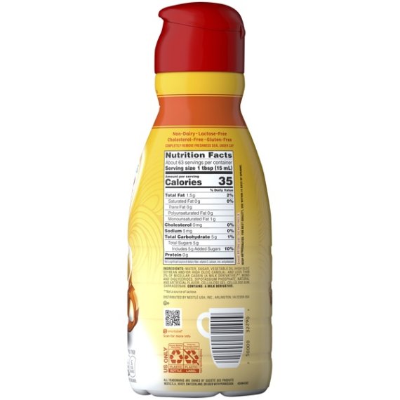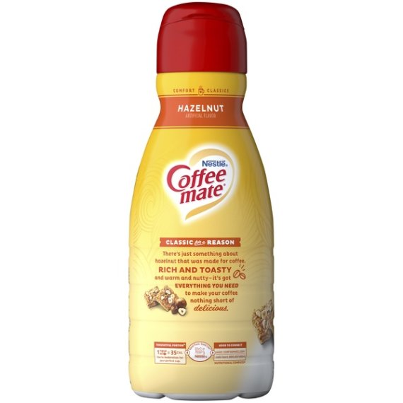 Details Ingredients Water, Sugar, Vegetable Oil (High Oleic Soybean and/or High Oleic Canola), and Less than 2% of Micellar Casein (a Milk Derivative)**, Mono- and Diglycerides, Dipotassium Phosphate, Natural and Artificial Flavor, Cellulose Gel, Cellulose Gum, Carrageenan. **Not a Source of Lactose. Show more Product features Linger over a warm cup of coffee in the morning blended with the nutty sweetness of Coffee-mate Hazelnut creamer. It is creamy and richly satisfying. This liquid coffee creamer comes in a 32 fl oz container. Free of dairy and lactose, it also contains no gluten. The concoction is cholesterol-free and has no trans fat. It also has only 35 calories per serving with 1.5g of fat. This creamer adds just the right amount of flavor morning, noon or night. Make your beverage even more special with this Coffee-mate coffee creamer. Coffee-Mate Coffee Creamer Hazelnut Liquid Creamer 32 fl oz: Non-dairy and lactose-free coffee creamer Coffee-mate coffee creamer has a delicious hazelnut flavor Gluten-free Cholesterol-free Transforms your coffee into creamy deliciousness 35 calories per serving with 1.5g of fat Special Features Lactose-free Net Quantity of Content 63.0 X 1 Tbsp. (15mL)
