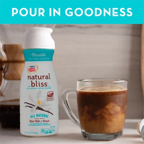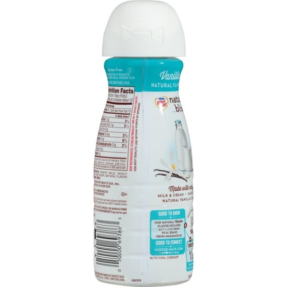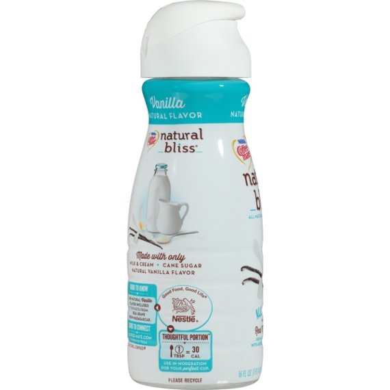 Details Ingredients Nonfat Milk, Heavy Cream, Cane Sugar, Natural Flavor. Product features Stir up an all-natural and delightful addition to your morning cup of coffee with Coffee mate NATURAL BLISS Vanilla flavor coffee creamer. With a smooth, rich, and delicious flavor, Vanilla is made with simple ingredients—milk, cream, cane sugar, and natural vanilla flavor. Liven up your cup with a sweet sip that is at its natural best and does not contain GMO ingredients or rBST treated milk.* Add naturally delicious goodness into every cup you pour, with NATURAL BLISS. Coffee mate NATURAL BLISS Vanilla flavor coffee creamer adds naturally delicious goodness into every cup you pour We start with real milk and cream from cows not treated with added growth hormones, blending in natural vanilla flavor that includes extract from real Madagascar vanilla beans for a smooth, rich flavor Stir in the natural flavor of Vanilla for a cup of deliciousness that has no GMO ingredients or added growth hormones* *No significant difference has been shown between milk from rBST treated and non rBST treated cows Add some all-natural love to your morning coffee and bring your cup to life with a rich, creamy taste that will have you coming back for another cup When you sip a cup of coffee made with Coffee mate NATURAL BLISS Vanilla, you can be sure that your morning is starting at its all-natural best Net Quantity of Content 32.0 X 1 Tbsp. (15mL)