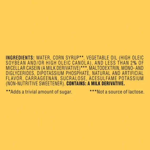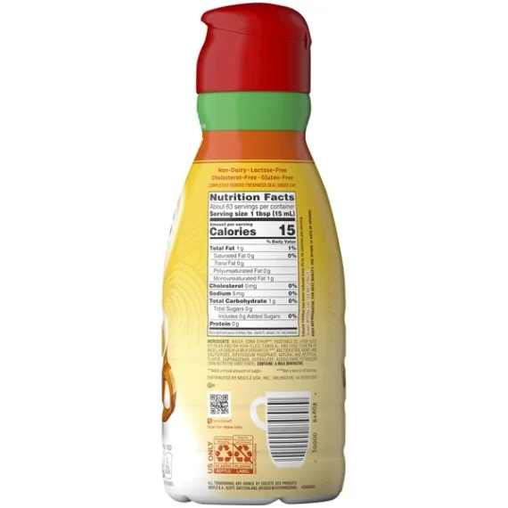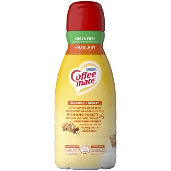 Details Ingredients Water, Corn Syrup**, Vegetable Oil (High Oleic Soybean and/or High Oleic Canola), and Less than 2% of Micellar Casein (a Milk Derivative)***, Maltodextrin, Mono- and Diglycerides, Dipotassium Phosphate, Natural and Artificial Flavor, Carrageenan, Sucralose, Acesulfame Potassium (Non-Nutritive Sweetener). **Adds a Trivial Amount of Sugar. ***Not a Source of Lactose.. Show more Product features Make your coffee complete with Nestle Coffeemate Coffee Creamer. Nestle Coffeemate is the only liquid creamer designed especially for coffee, adding a smooth and creamy taste while still allowing the flavor of your favorite blends to shine through in every sip. Coffeemate hazelnut creamer is one of the most popular flavors, beloved for its rich, roasted hazelnut flavor. This sugar-free counterpart makes it easy to enjoy the inimitable taste without any added sugar. The creamer has the same smooth consistency, but without any fat, lactose or sugars. Each serving of the sugar free coffee creamer contains just 15 calories; each 32 fl oz bottle yields 63 servings. Nestle Coffeemate Sugar Free Hazelnut Liquid Coffee Creamer, 32 fl oz bottle: 15 calories per serving Free from saturated fat, trans fat, polyunsaturated fat, monounsaturated fat, cholesterol, lactose and sugars Low in sodium Rich, nutty flavor of toasted hazelnuts to please nearly any palette Adds a depth of flavor while still allowing the taste of your favorite grinds to shine through Sugar free coffee creamer has rich and creamy taste and texture Contains artificial flavors Contains sodium caesinate, a milk derivative Each 32 oz bottle contains 63 servings Freshness seal under cap locks in flavor; use within 14 days of opening Shake well before each use and refrigerate after opening Special Features Cholesterol free Net Quantity of Content 63.0 X 1 Tbsp. (15mL)