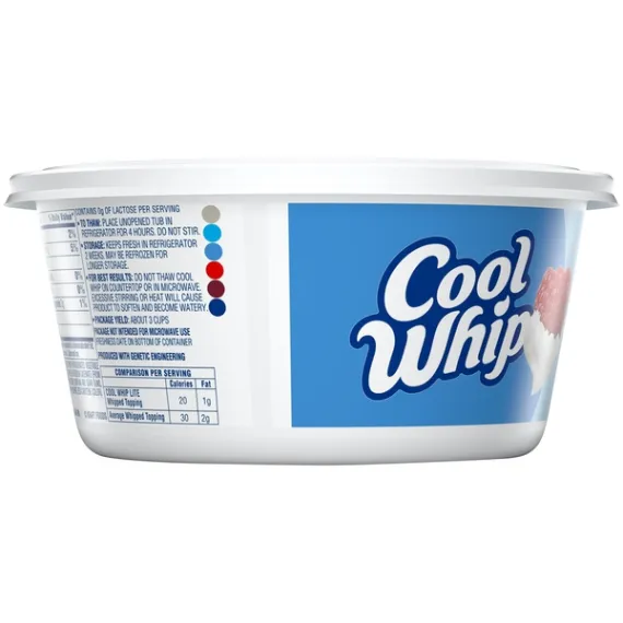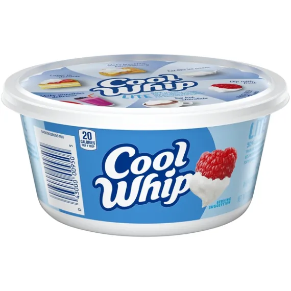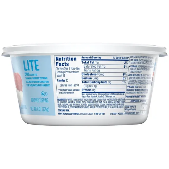 Details Ingredients Water, Corn Syrup, High Fructose Corn Syrup, Hydrogenated Vegetable Oil (Coconut And Palm Kernel Oils), Contains Less Than 2% Of Sodium Caseinate (From Milk), Natural And Artificial Flavor, Modified Food Starch, Xanthan And Guar Gums, Polysorbate 60, Sorbitan Monostearate, Sodium Polyphosphate, Beta Carotene (Color). Show more Product features Cool Whip Lite Whipped Topping is ideal as a topping or recipe ingredient. Enjoy the creamy, fluffy taste you love with 50% less fat than average whipped topping. This whipped topping makes the perfect addition to your favorite dessert. Dollop this packaged whipped topping on pumpkin pie, blueberry cheesecake, chocolate pudding or fruit salad for extra sweetness. Use it as the perfect finishing touch on an ice cream sundae or mug of hot cocoa. The convenient 8 ounce resealable tub keeps the whipped topping fresh. Place unopened tub in refrigerator for 4 hours to thaw. Do not stir. Keeps fresh in refrigerator for 2 weeks. May be refrozen for longer storage. One 8 oz. package of Cool Whip Lite Whipped Topping Cool Whip Lite Whipped Topping is perfect as a topping or recipe ingredient One-of-a-kind, creamy addition to any dessert creation Light whipped topping with 50% less fat than average whipped topping No trans fat with a total of 1 g. of fat per serving Top ice cream, pie, cheesecake or hot cocoa Resealable container stays fresh in the refrigerator for two weeks after thawing Special Features Contains 0g of lactose per serving Net Quantity of Content 25.0 X 2 Tbsp (9g)