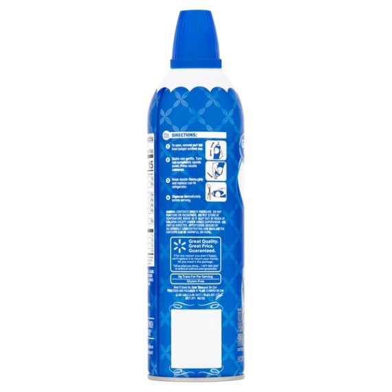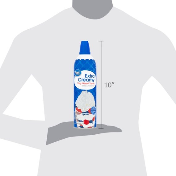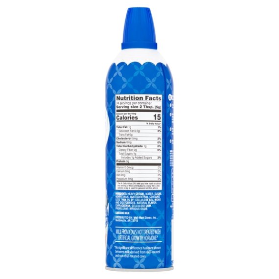 Details Ingredients HEAVY CREAM, SUGAR, CONTAINS LESS THAN 1% OF: ARTIFICIAL FLAVOR, MONO AND DIGLYCERIDES, POLYSORBATE 80, CARRAGEENAN, MIXED TOCOPHEROLS (VITAMIN E) TO PROTECT FLAVOR, PROPELLANT: NITROUS OXIDE. Show more Product features Milk from cows not treated with artificial growth hormone* *No significant difference has been shown between milk derived from rBST-treated and non-rBST-treated cows. Great Value Extra Creamy Dairy Whipped Topping is made with real cream and has a rich, decadent flavor that will be sure to delight your taste buds. This delicious whipped topping not only tastes amazing; with just 1 gram of sugar per serving, zero grams of trans fats, and zero gluten, it's the perfect accompaniment to tasty treats and a healthy lifestyle. The smooth, extra creamy goodness also comes at a great price. It's an excellent value that you can store easily in your cupboard or fridge after it's opened, so you can stock up without worrying about waste. Take your breakfast, dessert, or steaming hot beverage to the next level by adding it to freshly made waffles, a warm slice of homestyle apple pie, or an old fashioned mug of yummy hot chocolate. Enjoy a fluffy white spoonful of Great Value Extra Creamy Dairy Whipped Topping anytime for a super sweet delight. Great Value products provide families with affordable, high quality grocery and household consumable options. With our wide range of product categories spanning grocery and household consumables, we offer you a variety of products for your family's needs. Our products are conveniently available online and in Walmart stores nationwide, allowing you to stock up and save money at the same time. Gluten free 0g trans fat per serving Only 15 calories per serving Made with real cream Net Quantity of Content 61 X 2 Tbsp