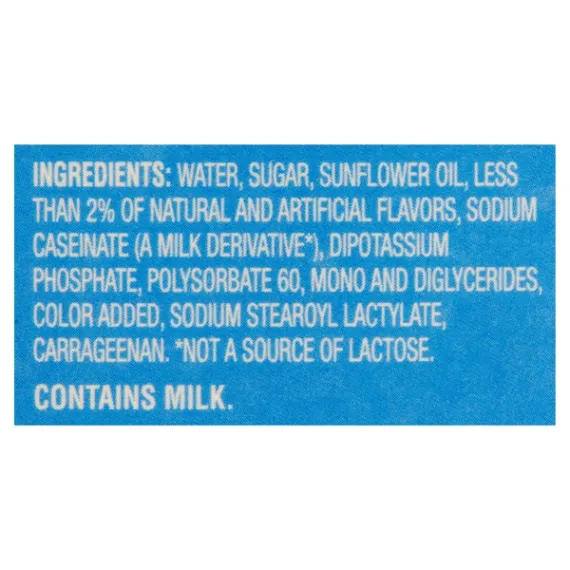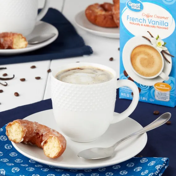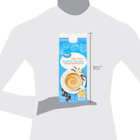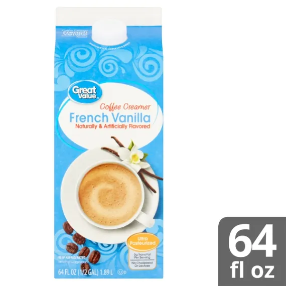 Details Ingredients WATER, SUGAR, PARTIALLY HYDROGENATED SOYBEAN AND COTTONSEED OIL AND LESS THAN 2% OF NATURAL AND ARTIFICIAL FLAVORS, SODIUM CASEINATE (A MILK DERIVATIVE*), DIPOTASSIUM PHOSPHATE, POLYSORBATE 60, MONO AND DIGLYCERIDES, COLOR ADDED, SODIUM STEAROYL LACTYLATE, CARRAGEENAN. *NOT A SOURCE OF LACTOSE. Show more Product features Take your morning brew to the next level with Great Value French Vanilla Coffee Creamer. Our coffee creamer contains only 30 tasty, tiny calories and 0 grams of trans fat per serving, making it an excellent choice for those pursuing a healthy lifestyle. Get creative by adding this creamer to homemade ice cream, a creamy smoothie, or your favorite baked treat. You'll look forward to your cup of coffee every morning with this sweet superstar on hand in your fridge. For great flavor at a great price, grab a bottle of Great Value French Vanilla Coffee Creamer today! Great Value products provide families with affordable, high quality grocery and household consumable options. With our wide range of product categories spanning grocery and household consumables, we offer you a variety of products for your family's needs. Our products are conveniently available online and in Walmart stores nationwide, allowing you to stock up and save money at the same time. French vanilla coffee creamer Ultra-pasteurized and gluten-free 0g trans fat per serving No cholesterol or lactose Kosher dairy 64fl oz container Net Quantity of Content 126 X 1 Tbsp