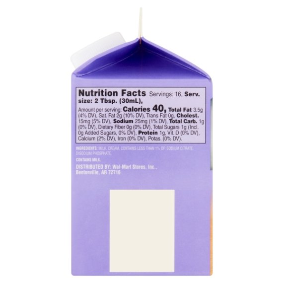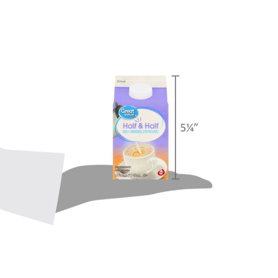Details Ingredients MILK, CREAM, CONTAINS LESS THAN 1% OF: SODIUM CITRATE, DISODIUM PHOSPHATE. Product features Make your morning coffee even more delicious with Great Value Half & Half Coffee Creamer. Our tasty coffee creamer elevates any warm beverage with fewer calories than traditional heavy cream. You can take comfort in knowing our Grade A coffee creamer has earned the REAL® Seal, assuring you are buying a genuine dairy product. Get creative in the kitchen by adding some of our half and half to mashed potatoes, scrambled eggs, or baked goods. You can even use it to make creamier smoothies or milkshakes. With only 40 tiny calories per serving, you can afford to indulge. Enjoy rich and creamy delight in every cup when you add Great Value Half & Half Coffee Creamer. Great Value products provide families with affordable, high quality grocery and household consumable options. With our wide range of product categories spanning grocery and household consumables, we offer you a variety of products for your family's needs. Our products are conveniently available online and in Walmart stores nationwide, allowing you to stock up and save money at the same time. Coffee creamer Grade A Homogenized Ultra-pasteurized 40 calories per serving 16fl oz container Special Features 40 calories per serving Net Quantity of Content 16 X 2 Tbsp