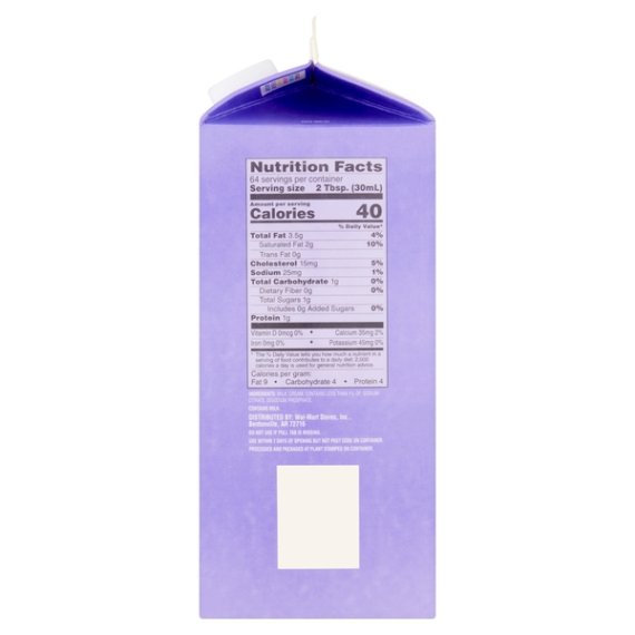 Details    Ingredients  MILK, CREAM, CONTAINS LESS THAN 1% OF: SODIUM CITRATE, DISODIUM PHOSPHATE.       Product features  Great Value Half & Half, 64 fl oz     Grade A, homogenized   Kosher - Dairy       Special Features  Kosher dairy    Net Quantity of Content   64 X 2 Tbsp