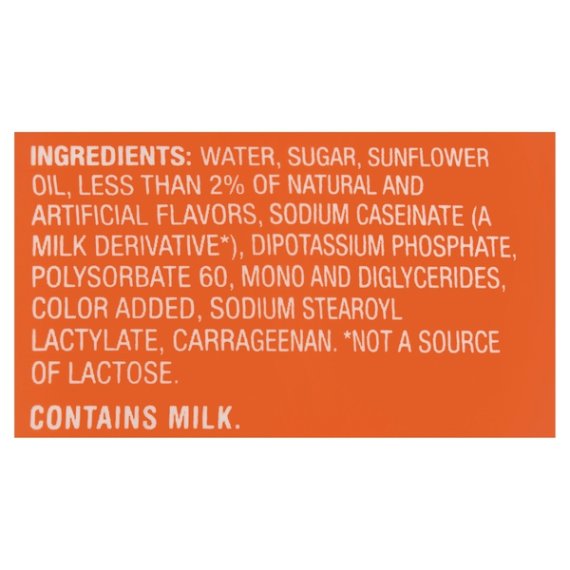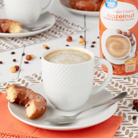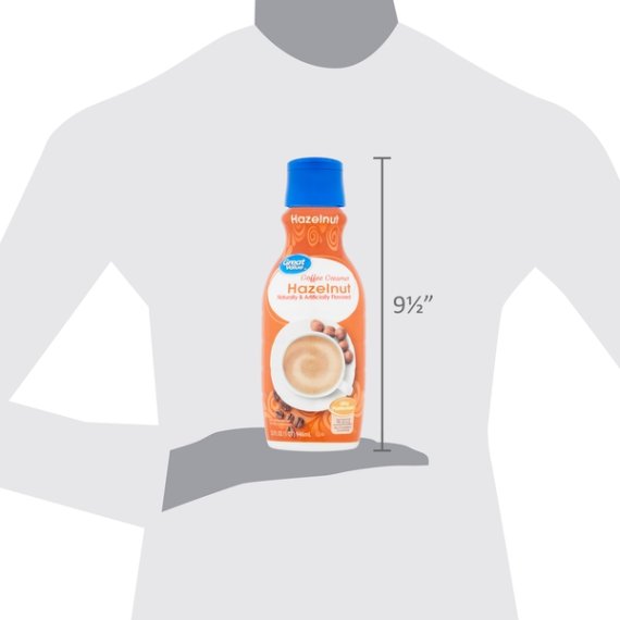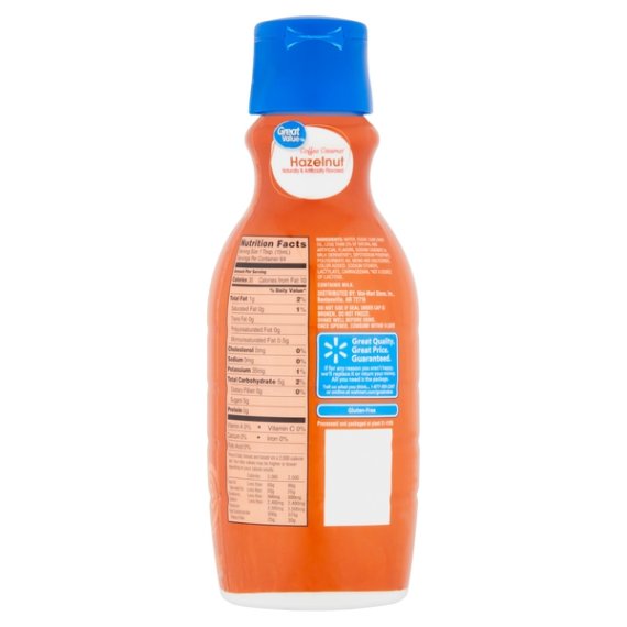 Details Ingredients Water, Sugar, Sunflower Oil, Less than 2% of Natural Artificial Flavors, Sodium Caseinate (a Milk Derivative*), Dipotassium Phosphate, Polysorbate 60, Mono and Diglycerides, Color Added, Sodium Stearoyl Lactylate, Carrageenan, *Not a source of Lactose Show more Product features Skip the coffee shop and make your morning brew at home with Great Value Hazelnut Coffee Creamer. Our delightful coffee creamer is only 30 tiny calories per serving, making it an excellent choice for the health-conscious consumer and a great alternative to traditional heavy cream. Get creative in the kitchen and swirl our coffee creamer into your next batch of baked fudgy brownies or whip it into whipped cream for a delicious nutty flavor you'll love. Make mornings magical with Great Value Hazelnut Coffee Creamer. Great Value products provide families with affordable, high quality grocery and household consumable options. With our wide range of product categories spanning grocery and household consumables, we offer you a variety of products for your family's needs. Our products are conveniently available online and in Walmart stores nationwide, allowing you to stock up and save money at the same time. Hazelnut coffee creamer Ultra-pasteurized and gluten-free 0g trans fat per serving No cholesterol or lactose 30 calories per serving Kosher dairy 32fl oz container Special Features Ultra-pasteurized Net Quantity of Content 64 X 1 Tbsp. (15mL)