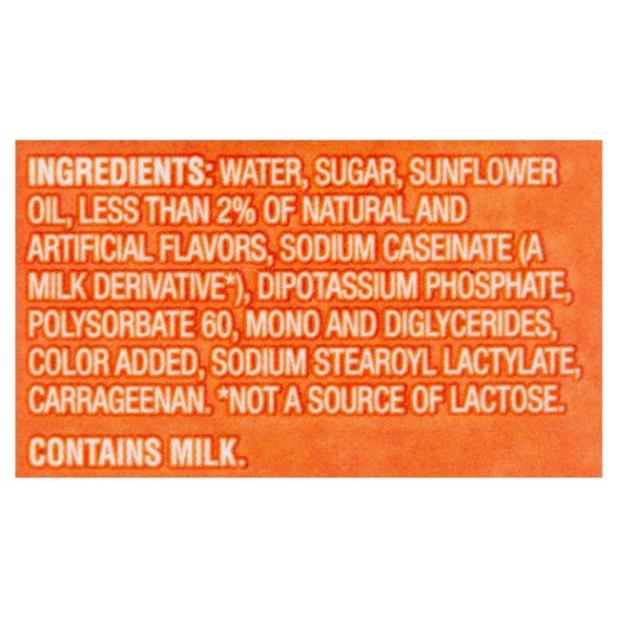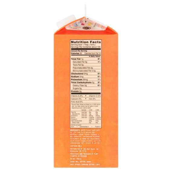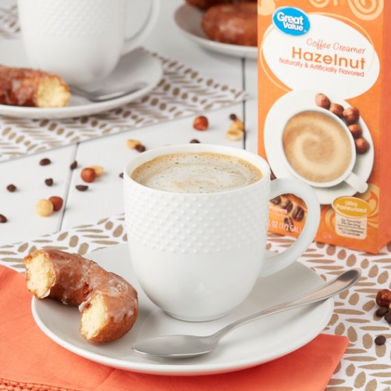 Details Ingredients WATER, SUGAR, SUNFLOWER OIL, LESS THAN 2% OF NATURAL AND ARTIFICIAL FLAVORS, SODIUM CASEINATE (A MILK DERIVATIVE*), DIPOTASSIUM PHOSPHATE, POLYSORBATE 60, MONO AND DIGLYCERIDES, COLOR ADDED, SODIUM STEAROYL LACTYLATE, CARRAGEENAN. Show more Product features Skip the coffee shop and make your morning brew at home with Great Value Hazelnut Coffee Creamer. Our delightful coffee creamer is only 30 tiny calories per serving, making it an excellent choice for the health-conscious consumer and a great alternative to traditional heavy cream. Get creative in the kitchen and swirl our coffee creamer into your next batch of baked fudgy brownies or whip it into whipped cream for a delicious nutty flavor you'll love. Make mornings magical with Great Value Hazelnut Coffee Creamer. Great Value products provide families with affordable, high quality grocery and household consumable options. With our wide range of product categories spanning grocery and household consumables, we offer you a variety of products for your family's needs. Our products are conveniently available online and in Walmart stores nationwide, allowing you to stock up and save money at the same time. Hazelnut coffee creamer Ultra-pasteurized and gluten-free 0g trans fat per serving No cholesterol or lactose 30 calories per serving Kosher dairy 64fl oz container Net Quantity of Content ABOUT 126 X 1 Tbsp
