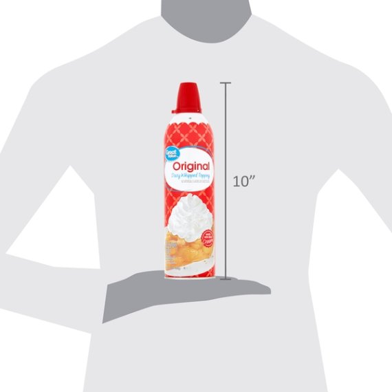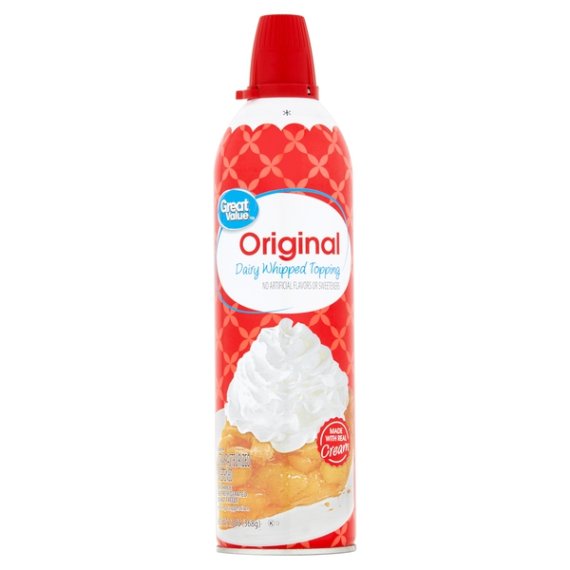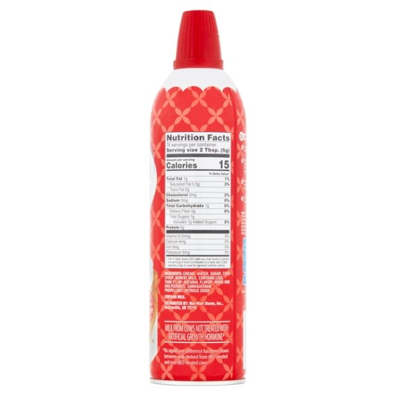 Details Ingredients CREAM, MILK, SUGAR, DEXTROSE, CONTAINS LESS THAN 1% OF: SORBITAN MONOSTEARATE, ARTIFICIAL FLAVOR, CARRAGEENAN, MIXED TOCOPHEROLS (VITAMIN E) TO PROTECT FLAVOR, PROPELLANT: NITROUS OXIDE. Show more Product features Milk from cows not treated with artificial growth hormone* *No significant difference has been shown between milk derived from rBST-treated and non-rBST-treated cows. You will want to put our delicious Great Value Original Dairy Whipped Topping on just about everything! This classic whipped topping is made with real cream and no artificial flavors or sweeteners, so you know you're only getting the highest quality on the shelves. Gently shake, turn the can upside down, and press the nozzle sideways to release the light-as-air cream onto your favorite desserts, fresh fruit, or hot chocolate. Put the finishing touch on strawberry shortcake or a warm brownie sundae for an extra sweet treat. Our fluffy cream makes desserts so mouth-watering you'll want to finish every last bite. The 13-ounce can is perfect to keep in the door of your fridge for whenever the craving strikes. Indulge in this childhood favorite with Great Value Original Dairy Whipped Topping! Great Value products provide families with affordable, high quality grocery and household consumable options. With our wide range of product categories spanning grocery and household consumables, we offer you a variety of products for your family's needs. Our products are conveniently available online and in Walmart stores nationwide, allowing you to stock up and save money at the same time. Made with real cream No artificial flavors or sweeteners Made with milk from artificial-growth-hormone-free, healthy cows Easy release can 13oz Net Quantity of Content 61 X 2 Tbsp