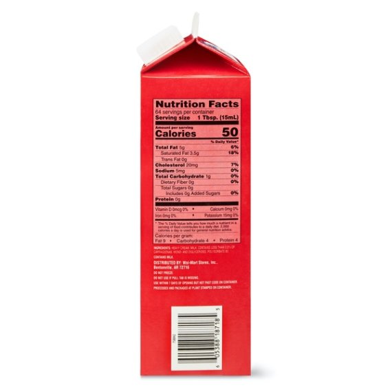 Details Ingredients HEAVY CREAM, MILK CONTAINS LESS THAN 0. 5% OF MONO AND DIGLYCERIDES, POLYSORBATE 80, CARRAGEENAN. Product features Add a layer of richness to a wide variety of cuisines with Great Value Heavy Whipping Cream, 32 oz. This heavy cream is delicious and contains zero grams of trans fat per serving, which means you can fell good about your choice! Use this luxurious cream to make silky whipped cream for baked goods and fresh fruit, enhance soup, or make homemade butter. Great Value Ultra-Pasteurized Real Heavy Whipping Cream, 32 oz, is the real deal, with no added artificial flavors or colors. Make your next recipe a success when you add this naturally gluten-free ultra-pasteurized whipping crem to the mix! Great Value products provide families with affordable, high-quality grocery and household consumable options.With our wide range of product categories spanning grocery and household consumables, we offer you a variety of products for your family's needs.Our products are conveniently available online and in Walmart stores nationwide, allowing you to stock up and save money at the same time. Great Value Heavy Whipping Cream, 32 Oz: Kosher dairy No trans fat Naturally gluten-free food NO artificial flavors or colors Grade A, ultra-pasteurized whipping cream 32 oz container Special Features Grade a, ultra-pasteurized Net Quantity of Content 64 X 1 Tbsp