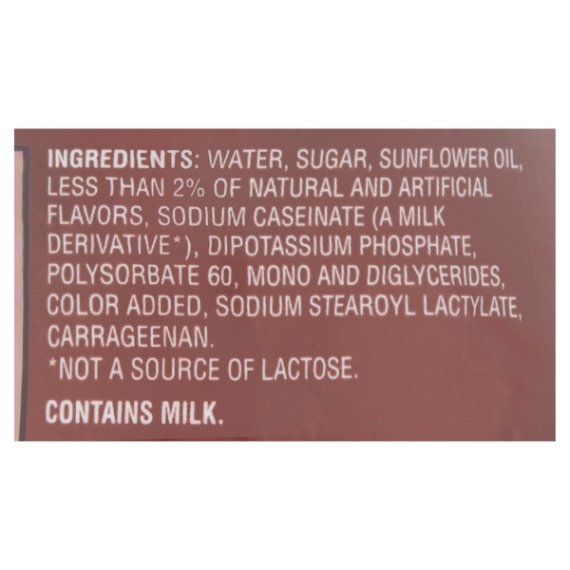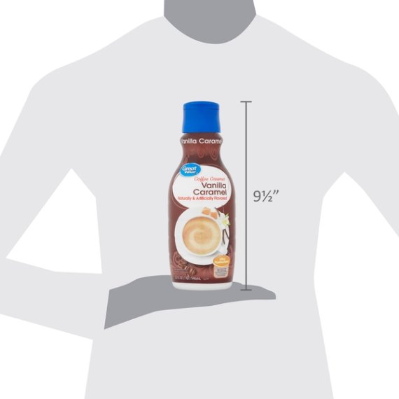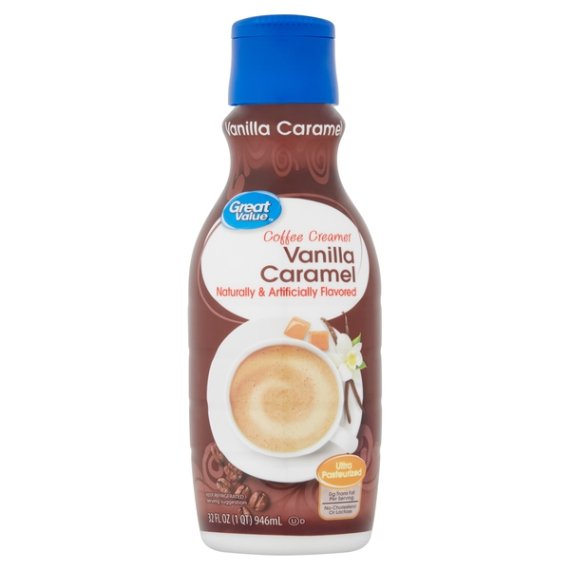 Details Ingredients WATER, SUGAR, PARTIALLY HYDROGENATED SOYBEAN AND COTTONSEED OIL AND LESS THAN 2% OF NATURAL AND ARTIFICIAL FLAVORS, SODIUM CASEINATE (A MILK DERIVATIVE*), DIPOTASSIUM PHOSPHATE, POLYSORBATE 60, MONO AND DIGLYCERIEDES, COLOR ADDED, SODIUM STEAROYL LACTYLATE, CARRAGEENAN. Show more Product features Start your day off right with a cup of fresh brewed hot or iced coffee complemented by Great Value Vanilla Caramel Coffee Creamer. This delicious ultra-pasteurized creamer comes in a resealable bottle that helps to preserve freshness after opening. It also features a pour spout to ensure you portion the perfect amount for your morning cup of joe. The sweet touch of this caramel creamer may even eliminate your desire for a spoonful of sugar, though you can still add it if you prefer. Bring the coffeehouse experience home today with Great Value Vanilla Caramel Coffee Creamer! Great Value products provide families with affordable, high quality grocery and household consumable options. With our wide range of product categories spanning grocery and household consumables, we offer you a variety of products for your family's needs. Our products are conveniently available online and in Walmart stores nationwide, allowing you to stock up and save money at the same time. 32fl oz container Ultra pasteurized 0 trans fat No cholesterol Special Features Ultra-pasteurized Net Quantity of Content 64 X 1 Tbsp