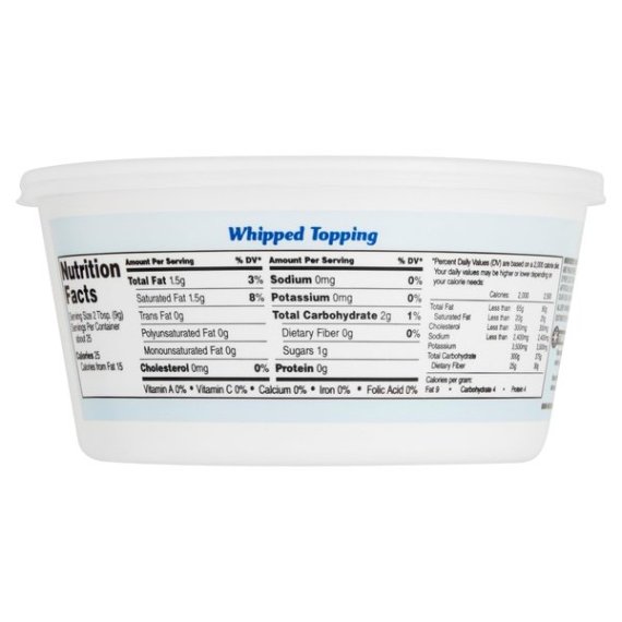 Details Ingredients Water, Hydrogenated Vegetable Oils (Coconut and Palm Kernel Oils), Corn Syrup, High Fructose Corn Syrup, Less than 2% of Sodium Caseinate (From Milk), Artificial Flavor, Polysorbate 60, Sorbitan Monostearate, Guar Gum, Xanthan Gum, Beta Carotene (Color) Show more Product features Great Value Whipped Topping, 8 Ounces Great Value Whipped Topping, Whipped Topping with a Light Creamy Texture. Enjoy as a Garnish or as an Ingredient in a Recipe. Special Features 25 calories per serving Net Quantity of Content ABOUT 25 X 2 Tbsp