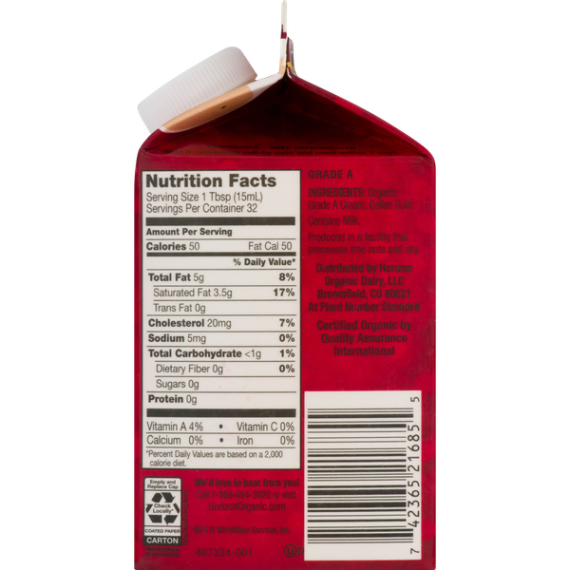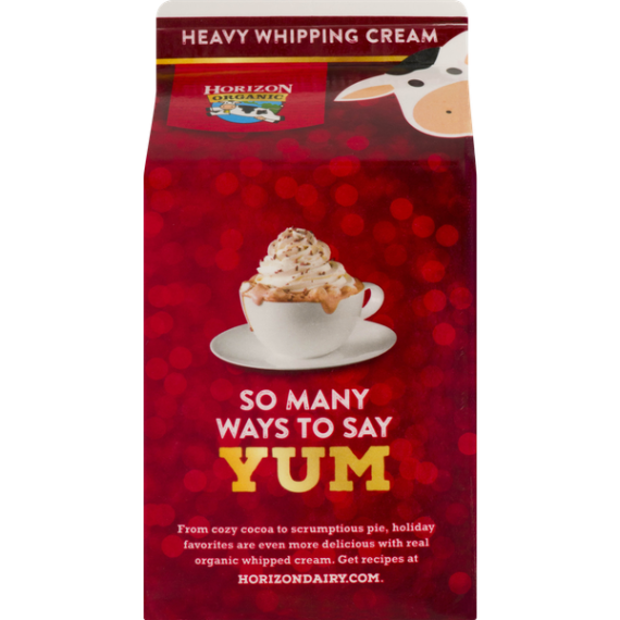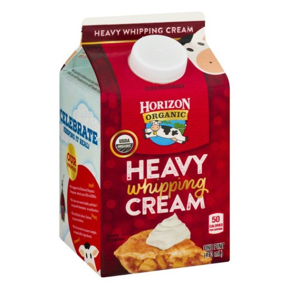 Details Ingredients Organic Grade A Cream, Gellan Gum. Contains: Milk. Product features Farmers are the heart of Horizon. We're proud to work with family farms all around the country to produce our dairy products. From sunny California to the rolling hills of upstate New York, local farming families are the heart of Horizon. Horizon Organic Heavy Whipping Cream. This product Ultra-pasteurized. No artificial colors, flavors or preservatives used in our product. This is a USDA organic certified product. Horizon Organic Heavy Whipping Cream, Pint: USDA Organic Grade A Ultra-pasteurized. Produced without GMO's No artificial colors, flavors or preservatives. Special Features Ultra-pasteurized Net Quantity of Content 32 X 1 Tbsp