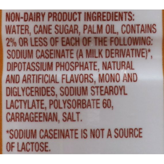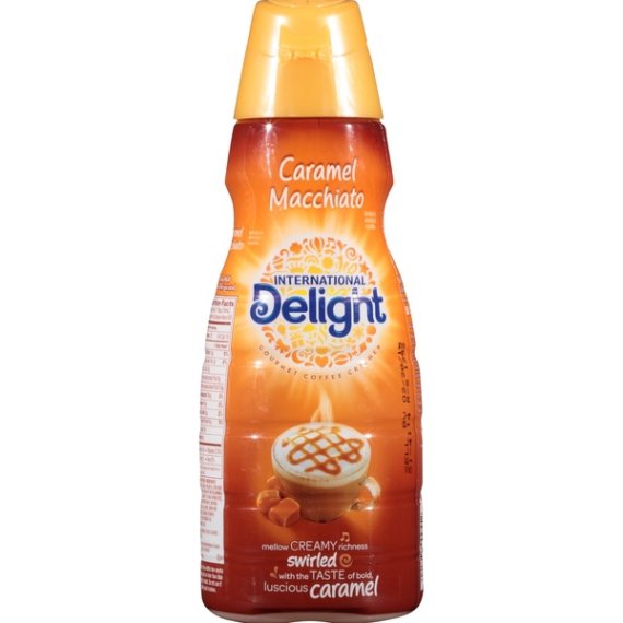 Details       Ingredients  Non-Dairy Product Water, Cane Sugar, Palm Oil, contains 2% or less of each of the following: Sodium Caseinate (A Milk Derivative)*, Dipotassium Phosphate, Natural and Artificial Flavors, Mono and Diglycerides, Sodium Stearoyl Lactylate, Polysorbate 60, Carrageenan, Salt.      Show more      Product features   This International Delight Coffee House Inspirations Caramel Macchiato Coffee Creameris a smart choice for people who enjoy flavoredadditions to their morning cup of joe. This luxurious creamer invites you to indulge your taste buds with the unique blend of rich, creamy sweetness and a tantalizing taste. Inspired by a caramel latte, this lactose-free,non-dairy coffeecreameris swirling with caramel goodness. Whether youre just starting your day or are taking a moment to recharge, this caramel macchiato coffee creameris delectable every time. This bottle ofcreamermeasures 32 oz.    International Delight Coffee House Inspirations Caramel Macchiato Coffee Creamer, 32 oz:      Non-dairy   0g trans fat   Lactose-free   Gluten-free   Kosher   Creamy swirl of pure, fragrant delight   caramel macchiato flavor   Delicious 32-oz coffee creamer       Net Quantity of Content   63 X 1 Tbsp