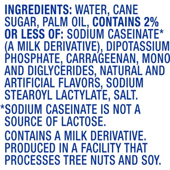 Details       Ingredients  Non-Diary Product Water, Cane Sugar, Palm Oil, contains 2% or less of: Sodium Caseinate (A Milk Derivative)*, Dipotassium Phosphate, Natural and Artificial Flavors, Mono and Diglycerdies, Sodium Stearoyl Lactylate, Polysorbate 60, Carrageenan, Salt.      Show more      Product features  International Delight Caramel Macchiato Coffee Creamer layers of creamy caramel and delicate vanilla flavors capture the taste of the coffeehouse. Feeling fancy without leaving the house. Take that, barista. Your Mug's BFF   International Delight Caramel Macchiato Coffee Creamer, Half Gallon:     Non-Dairy Creamer   Half Gallon   2X larger than a quart   Easy pour grip   Kosher   Non GMO       Net Quantity of Content   128 X 1 Tbsp