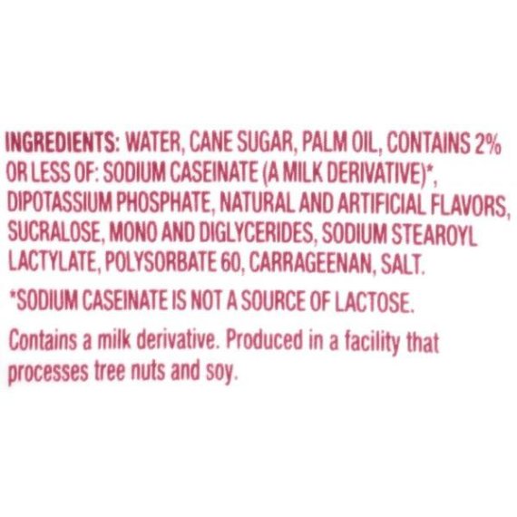 Details Ingredients Water, Cane Sugar, Palm Oil, contains 2% or less of: Sodium Caseinate (A Milk Derivative)*, Dipotassium Phosphate, Natural and Artificial Flavors, Sucralose, Mono and Diglycerides, Sodium Stearoyl, Lactylate, Polysorbate 60, Carrageenan,Salt. *Sodium caseinate is not a source of Lactose. Contains: A Milk Derivative. Show more Product features Do you dream in ice cream? Sweet dreams come true with the indulgent flavor of homemade ice cream in International Delight Cold Stone Creamery Sweet Cream Non-Dairy Coffee Creamer 64oz . International Delight Coldstone Creamery Sweet Cream Coffee Creamer: Non Dairy Creamer Half Gallon 2x larger than a quart Easy pour grip Gluten free Lactose free Non GMO Kosher Net Quantity of Content 128 X 1 Tbsp