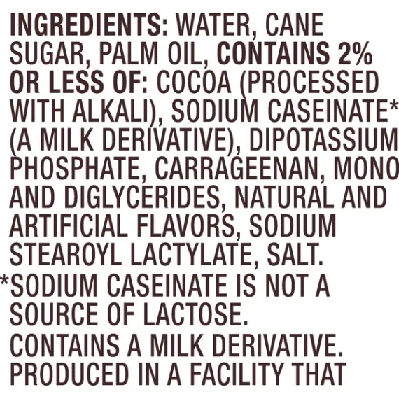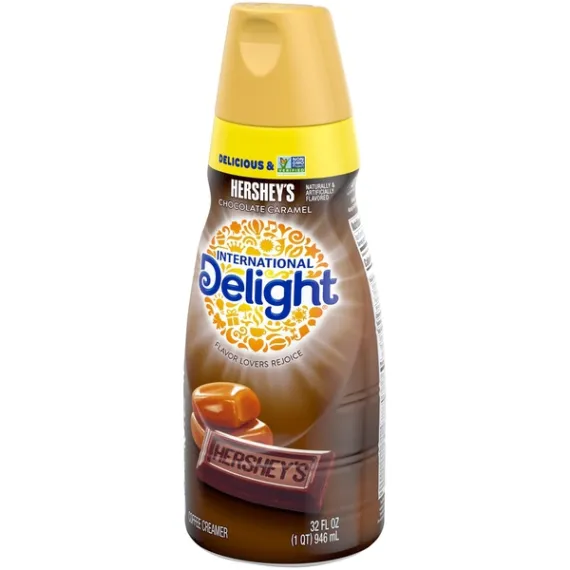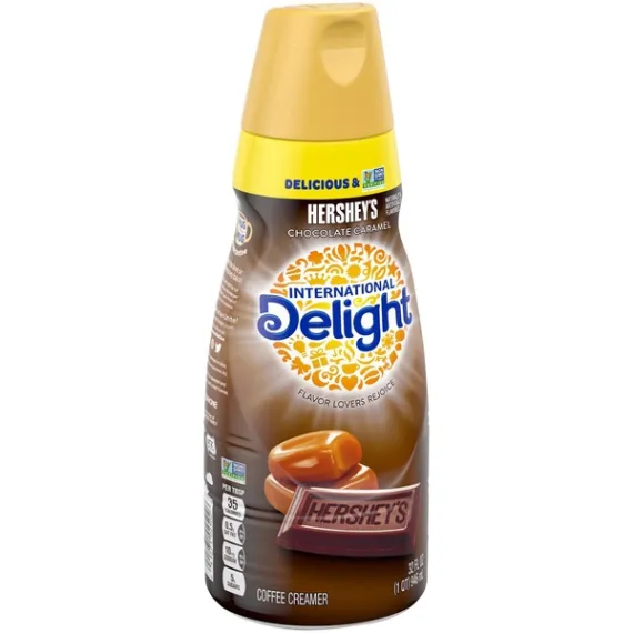 Details Ingredients Non-Dairy Product Water, Cane Sugar, Palm Oil, contains 2% or less of each of the following: Cocoa (Processed with Alkali), Sodium Caseinate* (A Milk Derivative), Dipotassium Phosphate, Natural and Artificial Flavors, Mono and Diglycerides, Sodium Stearoyl Lactylate, Polysorbate 60, Carrageenan, Salt. Show more Product features International Delight Chocolate Caramel Gourmet Non-Dairy Coffee Creamer 32oz.has the Unforgettable taste of creamy Hershey's chocolate swirled with Rich caramel flavor International delight Gourmet Coffee Creamer Hershey's Chocolate Caramel. Naturally & artificially flavored. American favorites. Gluten-free. Lactose-free. 0g trans fat. Per Tbsp: 35 Calories. 1g sat fat, 5% DV. 0mg sodium, 0% DV. 6g sugars. Lactose Free Special Features 0 trans fat Net Quantity of Content 63 X 1 Tbsp