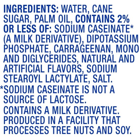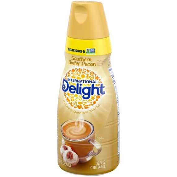 Details Ingredients Water, Cane Sugar, Palm Oil, contains 2% or less of: Sodium Caseinate* (A Milk Derivative), Dipotassium Phosphate, Natural and Artificial Flavors, Mono and Diglycerides, Sodium Stearoyl Lactylate, Polysorbate 60, Carrageenan, Salt. Show more Product features International Delight Southern Butter Pecan Non-Dairy Coffee Creamer 32oz. will make your cup sing with warm notes of pecan. Non-dairy 0g trans fat Lactose free Gluten free Kosher Creamy swirl of pure, fragrant delight Southern Butter Pecan flavor Delicious gluten-free coffee creamer Net Quantity of Content 63 X 1 Tbsp