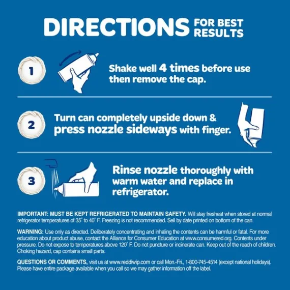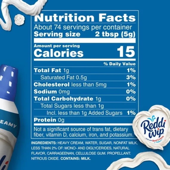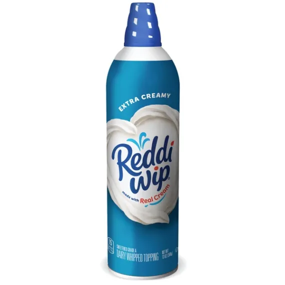Details Ingredients Heavy Cream, Water, Sugar, Nonfat Milk, Less than 2% of: Maltodextrin, Cellulose Gel, Mono- and Diglycerides, Natural Flavor, Carrageenan, Cellulose Gum. Propellant: Nitrous Oxide. CONTAINS: MILK. Show more Product features Reddi-wip Extra Creamy Whipped Dairy Cream Topping offers even more full, rich cream taste. Enjoy this dairy whipped topping on ice cream sundaes, fruit, angel food cake and other desserts. Like whipped cream, Reddi-wip Extra Creamy is made with real cream as the first ingredient and has no artificial flavors or sweeteners. Real cream means real flavor with 15 calories per serving. Find that finishing touch to top off all of your favorite sweet treats; add an extra creamy whoosh of greatness. Shake well before use. Contains one 13-ounce can of Reddi-wip Extra Creamy Whipped Dairy Cream Topping Can Extra creamy whipped topping for cake, pie, hot cocoa or as a base for whipped cream frosting Real dairy cream is the #1 ingredient 15 calories per serving with no artificial flavors or sweeteners Top off ice cream sundaes, milkshakes and other desserts No hydrogenated oils like some other guys Net Quantity of Content 74.0 X 5g