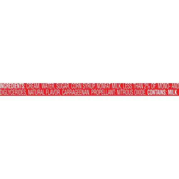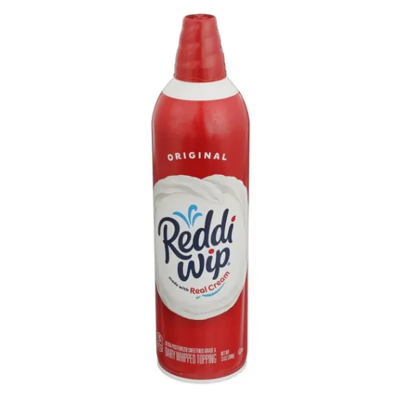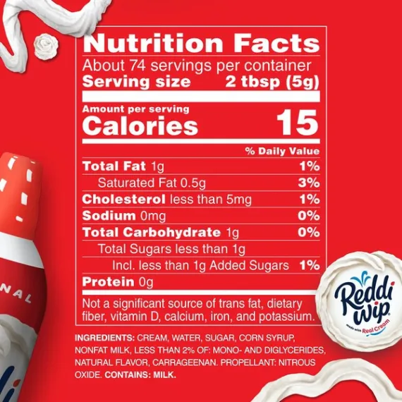 Details Ingredients Cream, Water, Sugar, Corn Syrup, Nonfat Milk, less than 2% of: Mono- and Diglycerides, Natural Flavor, Carrageenan. Propellant: Nitrous Oxide. Product features Let's play! Reddi-wip Original Whipped Dairy Cream Topping serves up delicious, rich cream taste —without adding hydrogenated oils like some other guys. Enjoy this dairy whipped topping on ice cream sundaes, strawberry shortcake, pumpkin pie, hot chocolate and other desserts. Like whipped cream, the Original Reddi-wip is made with real cream as the first ingredient and has no artificial flavors or sweeteners. Real cream means real flavor with 15 calories per serving. Now that's something to be joyful about. Shake well before use. Contains one 13-ounce can of the Original Reddi-wip Whipped Dairy Cream Topping Original dairy whipped topping for pie, pancakes or as a base for whipped cream frosting Real dairy cream is the #1 ingredient 15 calories per serving with no artificial flavors or sweeteners Top off ice cream sundaes, milkshakes and other desserts No hydrogenated oils like some other guys Net Quantity of Content 74.0 X 5g