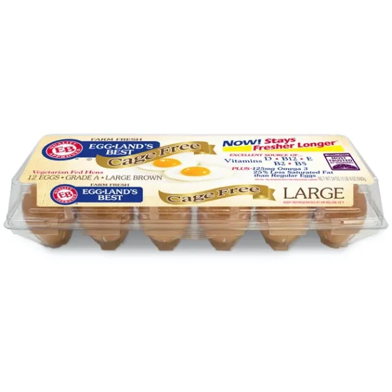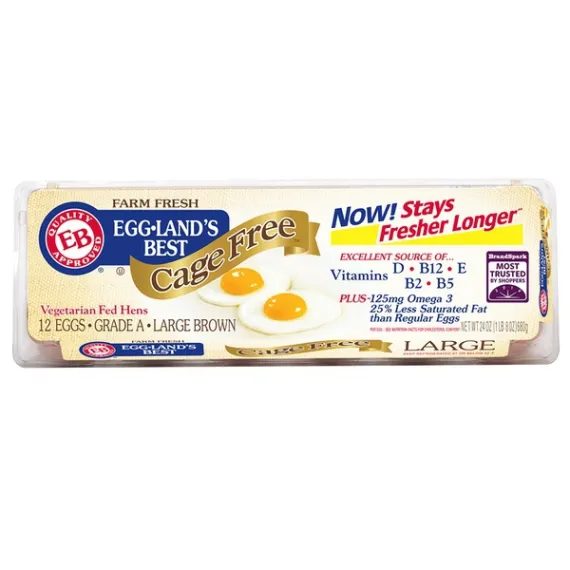 Details Ingredients Eggs. Product features Eggland's Best Cage Free eggs are avaliable in multiple sizes and have the same great nutrition as EB classic eggs. Egg-Land's Best Cage Free Large Brown Grade A Eggs, 12 Count EB Cage Free eggs are an excellent souce of vitamin B2 and vitamin B5 and can be part of a cholesterol conscious diet. Special Features 100Mg of omega 3 Net Quantity of Content 12 X 50 g