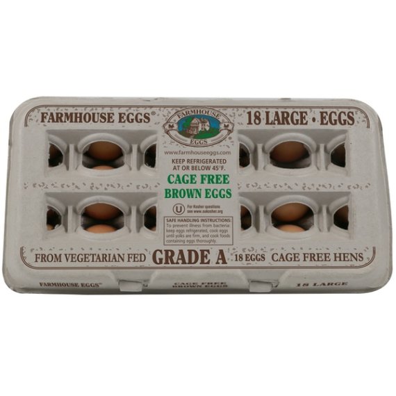 Details Ingredients Brown Eggs. Product features Farmhouse brown eggs come from cage free hens fed a wholesome diet.> Farmhouse Cage Free Large Brown Grade A Eggs, 18 Count Farmhouse eggs are wholesome and great tasting. Net Quantity of Content 18 X 50 G