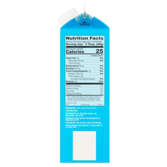 Details Ingredients EGG WHITES. Product features Enjoy a delicious meal that's light on calories but not on taste with Great Value 100% Liquid Egg Whites. Use them to create a savory omelet, make tasty meringues, or add them to your next homemade quiche. With zero cholesterol, 5 grams of protein, and only 25 calories per 3-tablespoon serving, these egg whites are an excellent choice for the health-conscious consumer or for those with egg allergies. With great quality at a great price, when you choose Great Value 100% Liquid Egg Whites, your wallet and your waistline will thank you. Great Value products provide families with affordable, high quality grocery and household consumable options. With our wide range of product categories spanning grocery and household consumables, we offer you a variety of products for your family's needs. Our products are conveniently available online and in Walmart stores nationwide, allowing you to stock up and save money at the same time. 100% liquid egg whites 25 calories per serving 0mg cholesterol per serving Pasteurized USDA inspected egg product Good source of protein 32oz container Special Features USDA inspected egg products Net Quantity of Content ABOUT 20 X 3 Tbsp