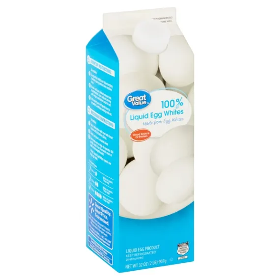 Details Ingredients EGG WHITES. Product features Enjoy a delicious meal that's light on calories but not on taste with Great Value 100% Liquid Egg Whites. Use them to create a savory omelet, make tasty meringues, or add them to your next homemade quiche. With zero cholesterol, 5 grams of protein, and only 25 calories per 3-tablespoon serving, these egg whites are an excellent choice for the health-conscious consumer or for those with egg allergies. With great quality at a great price, when you choose Great Value 100% Liquid Egg Whites, your wallet and your waistline will thank you. Great Value products provide families with affordable, high quality grocery and household consumable options. With our wide range of product categories spanning grocery and household consumables, we offer you a variety of products for your family's needs. Our products are conveniently available online and in Walmart stores nationwide, allowing you to stock up and save money at the same time. 100% liquid egg whites 25 calories per serving 0mg cholesterol per serving Pasteurized USDA inspected egg product Good source of protein 32oz container Special Features USDA inspected egg products Net Quantity of Content ABOUT 20 X 3 Tbsp