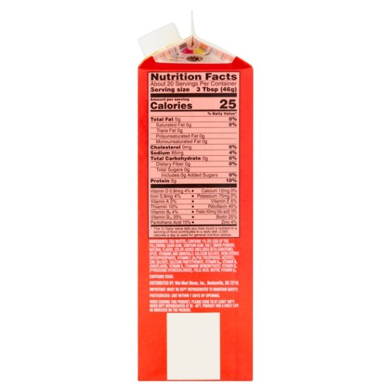 Details Ingredients EGG WHITES, CONTAINS 1% OR LESS OF THE FOLLOWING: GUAR GUM, XANTHAN GUM, SPICES, SALT, ONION POWDER, NATURAL FLAVOR, COLOR (INCLUDES BETA-CAROTENE). VITAMINS AND MINERALS: CALCIUM SULFATE, IRON (FERRIC ORTHOPHOSPHATE), VITAMIN E (ALPHA-TOCOPHEROL ACETATE), ZINC SULFATE, CALCIUM PANTOTHENATE, VITAMIN B12, VITAMIN B2 (RIBOFLAVIN), VITAMIN B1 (THIAMINE MONONITRATE), VITAMIN B6 (PYRIDOXINE HYDROCHLORIDE), FOLIC ACID, BIOTIN, VITAMIN D3. Show more Product features Ditch the cholesterol-packed carton of eggs without sacrificing protein or flavor with Great Value Fat Free & Cholesterol Free Egg Makers. This healthy substitute is made from real egg whites and contains just 25 calories per 3-tablespoon serving. Simply shake the box well before pouring its contents to make seamless scrambled eggs, omelets, or any other dish that call for eggs! Each 32-ounce container features a convenient screw-on cap and a clear diagram that makes it easy to calculate the proper amount for recipes. Take a step in the heart-healthy direction with Great Value Fat Free & Cholesterol Free Egg Makers. Great Value products provide families with affordable, high quality grocery and household consumable options. With our wide range of product categories spanning grocery and household consumables, we offer you a variety of products for your family's needs. Our products are conveniently available online and in Walmart stores nationwide, allowing you to stock up and save money at the same time. 32oz container Made from real egg whites Good source of protein Fat free and cholesterol free Special Features Good source of protein Net Quantity of Content ABOUT 20 X 3 Tbsp