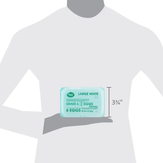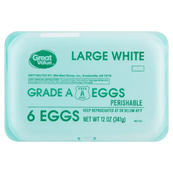 Details Product features Great Value Large White Eggs are a delicious way to get in your daily recommended amount of protein for a healthy lifestyle. Our tasty eggs have received a Grade A rating from the USDA, so you know you're purchasing a high-quality product. Serve them scrambled alongside some rye toast and sliced strawberries, or hard boil a few to take with you for a tasty, wholesome snack on the go. You'll love the nutrients jam-packed into this tiny, protein-filled superstar. Make breakfast time, dinner time, or anytime healthier with Great Value Large White Eggs. Great Value products provide families with affordable, high quality grocery and household consumable options. With our wide range of product categories spanning grocery and household consumables, we offer you a variety of products for your family's needs. Our products are conveniently available online and in Walmart stores nationwide, allowing you to stock up and save money at the same time. 6 eggs White, large USDA Grade A Good source of protein Net Quantity of Content 6 X 1 Egg