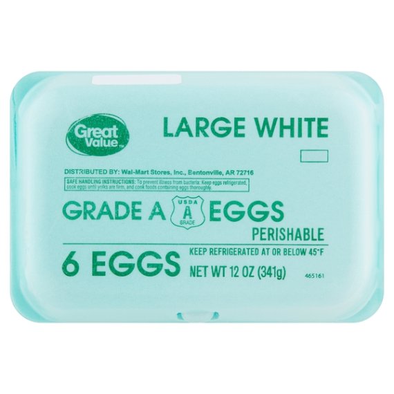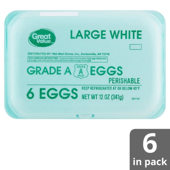 Details     Product features  Great Value Large White Eggs are a delicious way to get in your daily recommended amount of protein for a healthy lifestyle. Our tasty eggs have received a Grade A rating from the USDA, so you know you're purchasing a high-quality product. Serve them scrambled alongside some rye toast and sliced strawberries, or hard boil a few to take with you for a tasty, wholesome snack on the go. You'll love the nutrients jam-packed into this tiny, protein-filled superstar. Make breakfast time, dinner time, or anytime healthier with Great Value Large White Eggs.    Great Value products provide families with affordable, high quality grocery and household consumable options. With our wide range of product categories spanning grocery and household consumables, we offer you a variety of products for your family's needs. Our products are conveniently available online and in Walmart stores nationwide, allowing you to stock up and save money at the same time.     6 eggs   White, large   USDA Grade A   Good source of protein       Net Quantity of Content   6 X 1 Egg