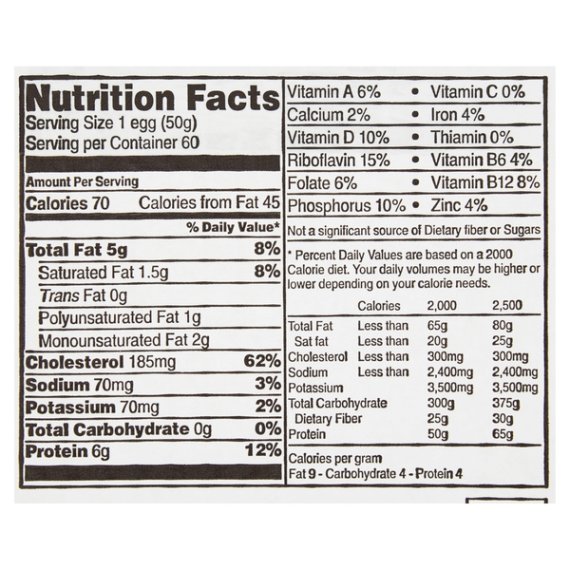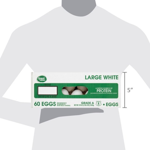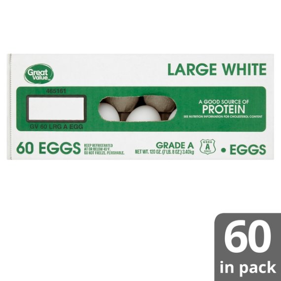Details Ingredients Egg Product features Great Value Large White Eggs are a delicious way to get in your daily recommended amount of protein for a healthy lifestyle. Our tasty eggs have received a Grade A rating from the USDA, so you know you're purchasing a high-quality product. Serve them scrambled alongside some wheat toast and melon, or hard boil a few to take with you for a tasty, wholesome snack on the go. You'll love the nutrients jam-packed into this tiny, protein-filled superstar. Make breakfast time, dinner time, or anytime healthier with Great Value Large White Eggs. Great Value products provide families with affordable, high quality grocery and household consumable options. With our wide range of product categories spanning grocery and household consumables, we offer you a variety of products for your family's needs. Our products are conveniently available online and in Walmart stores nationwide, allowing you to stock up and save money at the same time. Box of 60 eggs White, large USDA Grade A Good source of protein Net Quantity of Content 60 X 50 g