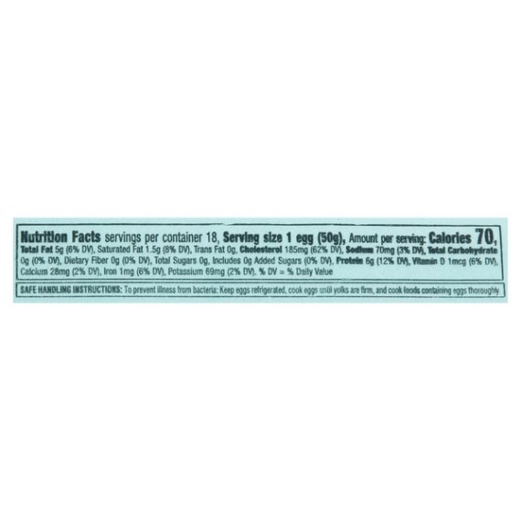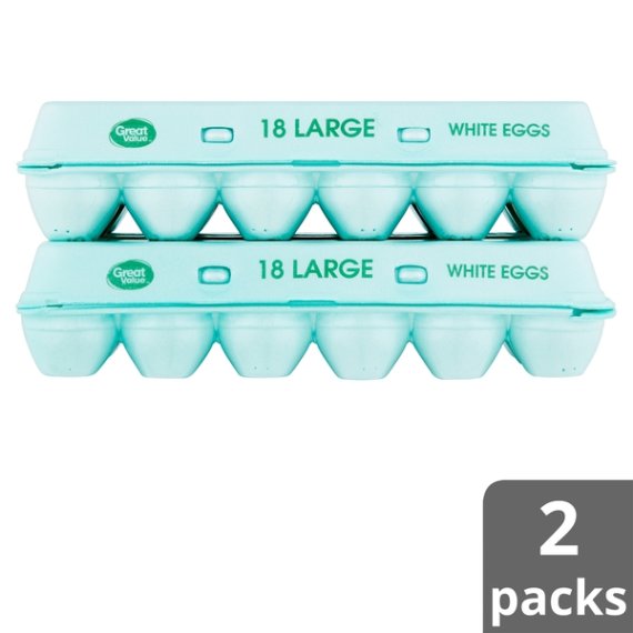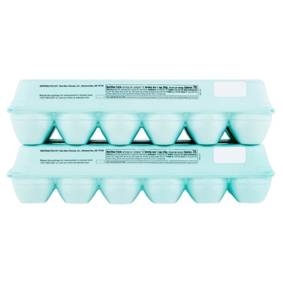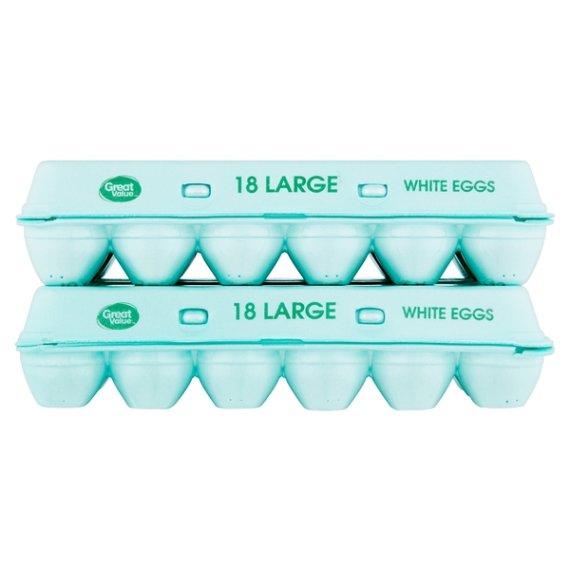 Details Ingredients Egg Product features Great Value Large White Eggs are a delicious way to get in your daily recommended amount of protein for a healthy lifestyle. Our tasty eggs have received a Grade A rating from the USDA, so you know you're purchasing a high-quality product. Serve them scrambled alongside some sourdough toast and blueberries, or hard boil a few to take with you for a tasty, wholesome snack on the go. You'll love the nutrients jam-packed into this tiny, protein-filled superstar. Make breakfast time, dinner time, or anytime healthier with Great Value Large White Eggs. Great Value products provide families with affordable, high quality grocery and household consumable options. With our wide range of product categories spanning grocery and household consumables, we offer you a variety of products for your family's needs. Our products are conveniently available online and in Walmart stores nationwide, allowing you to stock up and save money at the same time. Twin pack -- (2) 18 egg packages 36 eggs in total White, large USDA Grade A Good source of protein Net Quantity of Content 18 X 50 g