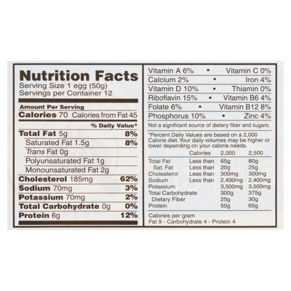 Details Ingredients Eggs Product features No home chef should be without Marketside Cage Free Large Brown Eggs. Our eggs come from hens that are free to roam, nest, and perch in a protected barn. Eggs are an excellent source of protein, as well as vitamin B5 and selenium, which are essential for a healthy diet. Use our eggs to create a variety of baked goods such as bread, fluffy pastries, cookies, cakes, and more. Make a delightful low-carb treat by baking one egg into half an avocado for a dose of healthy fats. When you want a quality product at a great price, choose Marketside Cage Free Large Brown Eggs. Fresh ideas and quality ingredients, that's how Marketside brings the best foods to your table. We are committed to deliver freshness that you can taste and see. Marketside offers the best in fresh food, guaranteed by Walmart, working in partnership with farmers, bakers and chefs for the highest quality, authentic ingredients and favorite recipes. 12 eggs Brown, large Farm fresh Cage-free Grade A eggs Net Quantity of Content 12 X 50 G