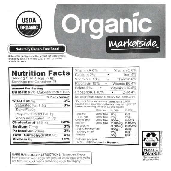 Details Ingredients Eggs Product features Marketside brings you delicious large brown eggs from hens that are raised on certified organic feed. These hens are free to roam, nest and perch in a protected barn with outdoor access, thus resulting in eggs of excellent quality of grade A. Eggs are a staple item of a filling breakfast, but they go far beyond just a morning meal. Use them in all your baking recipes, fried rice or as a topping on burgers. Transform them into your favorite style of cooked eggs whether it be sunny-side up, fried, boiled, pouched, scrambled or as an omelet. Serve with crispy turkey bacon, fresh fruit and toast for a satisfying breakfast. These eggs are a great source of high quality protein, vitamins and minerals, and are a naturally gluten-free food. Great Value products provide families with affordable, high quality grocery and household consumable options. With our wide range of product categories spanning grocery and household consumables, we offer you a variety of products for your family's needs. Our products are conveniently available online and in Walmart stores nationwide, allowing you to stock up and save money at the same time. Marketside Organic Large Cage Free Brown Eggs, 1 dz Net Quantity of Content 18 X 1 Ea