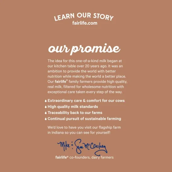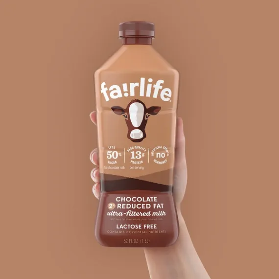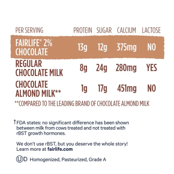 Details Ingredients Ingredients: Reduced Fat Ultra-Filtered Milk, Sugar, Alkalized Cocoa, Lactase Enzyme, Dipotassium Phosphate, Salt, Acesulfame Potassium, Carrageenan, Natural and Artificial Flavors, Sucralose, Vitamin A Palmitate, Vitamin D3. Contains: Milk. Show more Product features The idea for this one-of-a-kind milk began at our kitchen table over 20 years ago. It was an ambition to provide the world with better nutrition while making the world a better place. Our fairlife family farmers provide high-quality, real milk, filtered for wholesome nutrition with exceptional care taken every step of the way. Our filtration process was inspired by the same process that removes impurities from water. Milk from our family-owned dairy farms flows through soft filters to concentrate its goodness for more of what you want and less of what you don’t. More protein, more calcium and less sugar. Fairlife Chocolate Reduced Fat 2% Ultra-Filtered Milk, 52 fl oz: 50% less sugar than chocolate milk 43% less fat than whole milk Fairlife chocolate milk has 9 essential nutrients, including vitamins A, D and B12 as well as magnesium and zinc 13 grams of protein per serving 140 calories per serving Lactose-free Cows not treated with rBST High in calcium 52 oz Net Quantity of Content ABOUT 7 X 1 cup