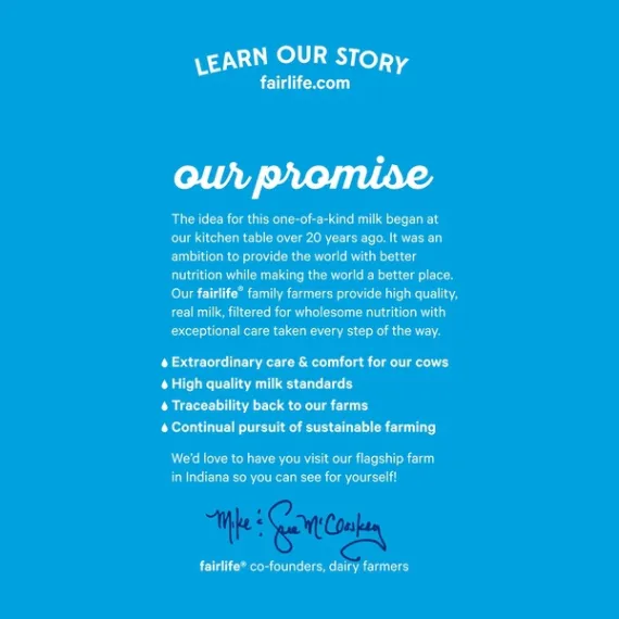 Details Ingredients Ingredients: Reduced Fat Ultra-Filtered Milk, Lactase Enzyme, Vitamin A Palmitate, Vitamin D3. Contains: Milk. Product features The idea for this one-of-a-kind milk began at our kitchen table over 20 years ago. It was an ambition to provide the world with better nutrition while making the world a better place. Our fairlife family farmers provide high-quality, real milk, filtered for wholesome nutrition with exceptional care taken every step of the way. Our filtration process was inspired by the same process that removes impurities from water. Milk from our family-owned dairy farms flows through soft filters to concentrate its goodness for more of what you want and less of what you don’t. More protein, more calcium and less sugar. Milk, Ultra-Filtered, 2% Reduced Fat 43% less fat than whole ultra-filtered milk (4.5 g vs 8 g per serving). 50% less sugar than regular milk. 13 g high quality protein per serving. 9 essential nutrients. From cows not treated with rBST (FDA states: no significant difference has been shown between milk from cows treated and not treated with rBST growth hormones). Lactose free. Learn our story. fairlife.com. Our Promise: We are dairy farmers who believe in better. From our farm in Fair Oaks, Indiana, along with all of our family farm partners, we started Fairlife to provide high quality real milk filtered for wholesome nutrition from farms where we take exceptional care at every step. Extraordinary care for our cows. High milk quality standards. Traceability back to our own farms. Pursuit of sustainable farming. - Mike & Sue McCloskey, Fairlife co-founders, dairy farmers. Real. Recycle me. Remove label before recycling. It's simple! Our milk flows through soft filters to concentrate its goodness like protein & calcium while filtering out much of the natural sugar. That allows us to bottle only delicious nutrient-rich ultra-filtered milk to fuel your busy life. Enjoy! Fairlife 2% per Serving: 13 g protein; 6 g sugar; 375 mg calcium; no lactose. Regular Milk per Serving: 8 g protein; 12 g sugar; 276 mg calcium; lactose. Almond Milk (Compared to the leading brand of Almond Milk) per Serving: 1 g protein; 7 g sugar; 451 mg calcium; no lactose. Let's chat! 855-Livefair. Homogenized, pasteurized, grade A. Net Quantity of Content ABOUT 7 X 1 cup