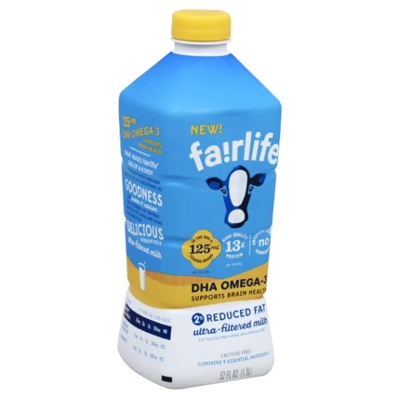 Details Ingredients Reduced Fat Ultra-Filtered Milk, DHA Omega-3 (Algal Oil), Vitamin A Palmitate, Lactase Enzyme, Vitamin C (Ascorbic Acid), Vitamin E (Tocopherols), Vitamin D3. Contains: Milk. Show more Product features Milk, Ultra-Filtered, 125mg DHA Omega-3, Super Kids, Reduced Fat, Bottle 52 OZ 125 mg DHA omega-3. With DHA omega-3. 38% less fat than ultra-filtered whole milk. From cows not treated with rBST (FDA states: no significant difference has been shown between milk from cows treated and not treated with rBST growth hormones). 35% daily value of calcium. 12 g high quality protein per serving. Believe in better. Why DHA omega-3s? Kids need the daily goodness of DHA omega-3s but what kid wants all that stinky fish?! That's why we only use meaningful levels of DHA omega-3 from 100% plant-based sources and offer almost 4x more than the leading competition (compared to leading national DHA omega brand) (4.5 g vs 8 g per serving). We help to nourish curious minds and growing bodies deliciously! Real. Recycle me. Remove label for better recycling. Let's chat! 855-Livefair. Homogenized, pasteurized & grade A. We help nourish your SuperKid. Fairlife for SuperKids reduced fat ultra-filtered milks boost the natural protein and calcium found in milk, eliminates added sugars, and provides meaningful levels of DHA omega-3s to help nourish curious minds and growing bodies so they can enjoy life's adventures. We Promise: meaningful levels of DHA omega-3; from cows not treated with rBST. Learn our story at fairlife.com. - Mike & Sue McCloskey, Co-founders, dairy farmers. Keep refrigerated. For best taste, consume within 14 days of opening. Contains milk. 52 fl oz (1.5 lt) Chicago, IL 60607 855-LIVEFAIR Ultra-Filtered Milk, Reduced Fat, 2% Milkfat Lactose free. 125 mg: 3x the DHA vs leading brand per serving. High Quality: 13 g protein per serving. No artificial growth hormones (FDA States: No significant difference has been shown between milk from cows treated and not treated with rBST growth hormones). New! DHA omega-3 supports brain health. 43% less fat than whole ultra-filtered milk (4.5 g vs 8 g per serving). Contains 9 essential nutrients. Our Promise: The idea for this one-of-a-kind milk began at our kitchen table over 20 years ago. It was an ambition to provide the world with better nutrition while making the world a better place. Our FairLife family farmers provide high quality, real milk, filtered for wholesome nutrition with exceptional care taken every step of the way. Extraordinary care and comfort for our cows. Exceptional quality milk standards. Traceability back to our farms. Continual pursuit of sustainable farming. We'd love to have you visit our flagship farm in Indiana so you can see for yourself! - Mike & Sue McCoskey, Fairlife co-founders, dairy farmers. Real. 125 mg DHA omega-3 supports brain health. What makes FairLife one-of-a-kind? All our milk flows through soft filters to concentrate its goodness like protein & calcium while filtering out natural sugars. So sip, drink and chug as you enjoy our delicious nutrient-rich ultra-filtered milk. FairLife DHA Omega-3: 125 mg DHA; 13 g protein; 8 g sugar; 350 mg calcium; no lactose per serving. Leading DHA Omega-3 Milk: 32 mg DHA; 8 g protein; 12 g sugar; 280 mg calcium and lactose per serving. Regular Milk: 0 mg DHA; 8 g protein; 12 g sugar; 280 mg calcium and lactose per serving. Homogenized, pasteurized, grade A. Let's chat! Learn our story fairlife.com. We don't use rBST, but you deserve the whole story! Learn more at fairline.com. Remove label for better recycling. Net Quantity of Content ABOUT 7 X 1 cup