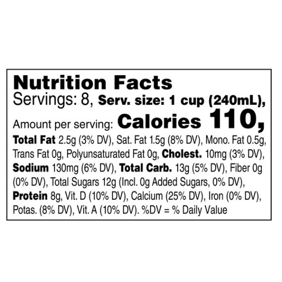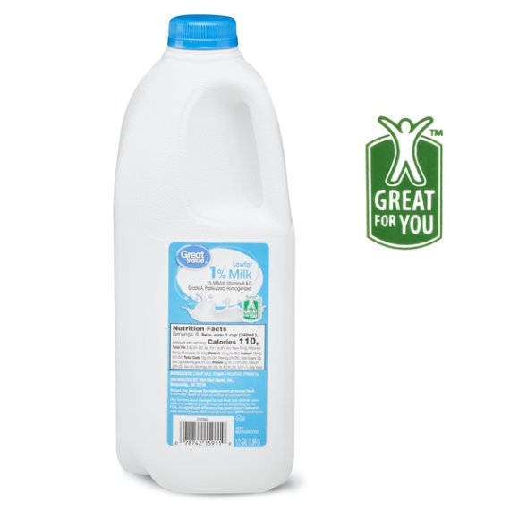 Details Ingredients LOWFAT MILK, VITAMIN A PALMITATE, VITAMIN D3. Product features Enjoy the wholesome goodness of Great Value Lowfat 1% Milk at any time. This Grade A quality milk is pasteurized and delivers fresh from the farm taste. This kitchen staple is great for using in cereal, to bake desserts and more. This gallon of milk is also wonderful for milkshakes, smoothies, chocolate milk and more. Enjoy a delicious classic and serve a cold glass of this milk with soft, chocolate chip cookies for dipping. It offers an abundance of nutritional benefits as it is a rich source of protein, calcium, potassium and vitamins A and D. It is great for health conscious individuals as it low in fat. Our farms have pledged to not treat any cows with any artificial growth hormones. Great Value products provide families with affordable, high quality grocery and household consumable options. With our wide range of product categories spanning grocery and household consumables, we offer you a variety of products for your family's needs. Our products are conveniently available online and in Walmart stores nationwide, allowing you to stock up and save money at the same time. Low fat milk, Vitamin A palmitate, Vitamin D3 No artificial growth hormones Grade A, pasteurized, homogenized 1% milkfat Special Features Vitamin a And d Net Quantity of Content 8.0 X 1 cup