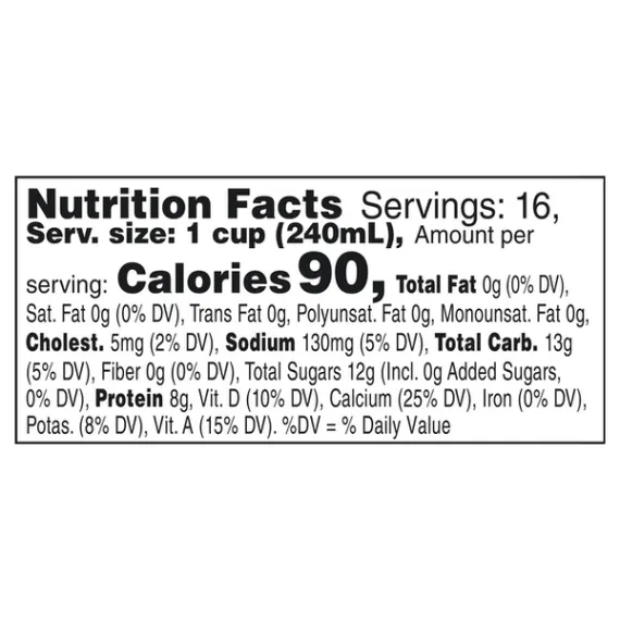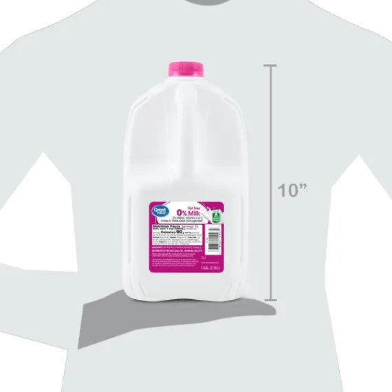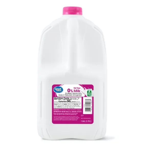 Details Ingredients Fat Free Milk, Vitamin A Palmitate, Vitamin D3. Product features Enjoy a bowl of cereal in the morning or add a rich depth to your fruit smoothie with Great Value Skim Milk. It's fat-free and packed with vitamin A, vitamin D3 and it contains no artificial growth hormones. This grade A 1 gallon skim milk is a pasteurized and homogenized beverage. It contains zero percent milkfat compared to regular whole milk. Great Value Skim Milk Gallon: Fat free milk, vitamin A palmitate, vitamin D3 No artificial growth hormones Grade A, pasteurized, homogenized 0% milkfat Use in cereals, smoothies and oatmeal Large single gallon size Calcium-rich fat-free milk Enjoy cold Special Features Vitamin a And d Net Quantity of Content 16 X 1 cup