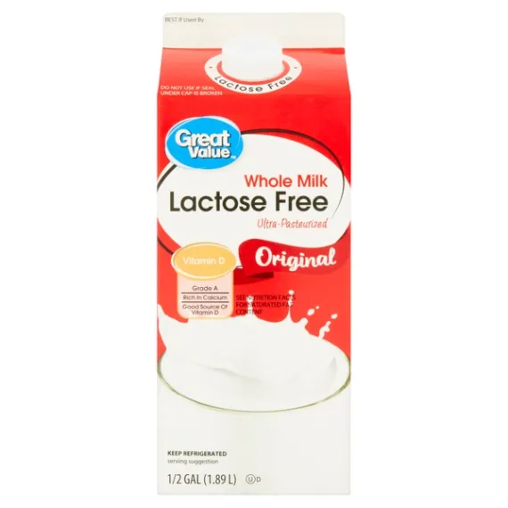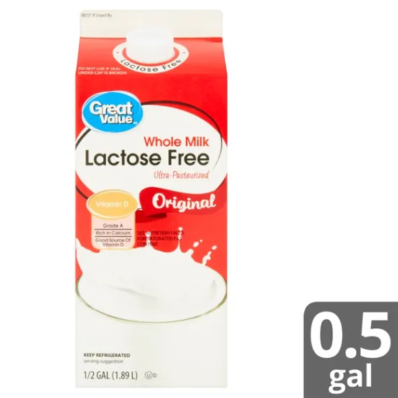 Details Ingredients MILK, CONTAINS LESS THAN 1% OF: LACTASE ENZYME*, VITAMIN D3. Product features Milk from cows not treated with artificial growth hormones*. * No significant difference has been shown between milk derived from rBST-treated and non-rBST-treated cows. Enjoy the wholesome taste of Great Value Lactose Free Original Whole Milk. Our farmers have pledged not to treat their cows with any artificial growth hormones, giving this grade A, ultra-pasteurized, quality milk a fresh-from-the-farm taste. Serve a chilled glass of our milk with soft, warm, chocolate chip cookies for dipping or try this milk in place of heavy cream in your coffee or tea. This kitchen staple is also great for using in cereals or as an ingredient in your home-baked goodies or creamy soups, all while knowing you won't experience uncomfortable gastrointestinal upset. Lose the lactose and grab a glass of Great Value Lactose Free Original Whole Milk. Great Value products provide families with affordable, high quality grocery and household consumable options. With our wide range of product categories spanning grocery and household consumables, we offer you a variety of products for your family's needs. Our products are conveniently available online and in Walmart stores nationwide, allowing you to stock up and save money at the same time. Lactose-free whole milk Ultra-pasteurized Grade A Rich in calcium Good source of vitamin D Gluten-free Milk from cows not treated with artificial growth hormones Special Features Ultra-pasteurized Net Quantity of Content 8 X 1 cup
