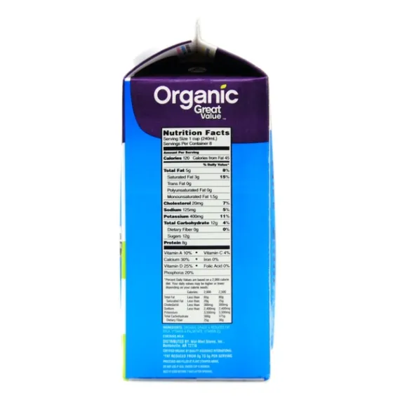Details Ingredients ORGANIC GRADE A REDUCED FAT MILK, VITAMIN A PALMITATE, VITAMIN D3. Product features Providing your family with quality dairy milk is always a priority. Try Great Value Organic 2% Reduced-Fat Milk for that delicious dairy taste and all the nutrients milk provides without all the unnecessary fat. Organic dairy milk from Great Value is USDA-certified organic and is sourced with no artificial flavors or preservatives to deliver great milk you can trust. Choosing the best organic reduced-fat milk brand can make all the difference. Choose Great Value Organic 2% Reduced-Fat Milk. Milk is a staple in most households. Great Value Organic 2% Reduced-Fat Milk is Grade A Organic and provides your family with necessary Vitamin A and Vitamin D3. Enjoy the nutritional benefits of organic milk without the synthetic growth hormones, fertilizers, pesticides, or antibiotics found in some other dairy products. Reduced-fat milk is extremely popular, but ours is anything but ordinary. Sourced from the healthiest cows and USDA Organic compliant farms, this nutritious reduced-fat milk will have your family coming back for seconds! Everyday Organics for Everyone USDA-certified organic* Organic certification requires that farmers and handlers document their processes and get inspected every year. Organic on-site inspections account for every component of the operation, including, but not limited to, seed sources, soil conditions, crop health, weed and pest management, water systems, inputs, contamination and commingling risks and prevention, and record-keeping. Tracing organic products from start to finish is part of the USDA organic promise. USDA-certified organic foods are grown and processed according to federal guidelines addressing, among many factors, soil quality, animal raising practices, pest and weed control, and use of additives. Organic producers rely on natural substances and physical, mechanical, or biologically based farming methods to the fullest extent possible. While we strive to obtain accurate product information, we cannot guarantee or ensure the accuracy, completeness or timeliness of any product information. We recommend that you do not solely rely on the information presented on this website and that you always read labels, warnings, and directions and other information provided with the product before using or consuming a product. For additional information about a product, please contact the manufacturer. Walmart.com assumes no liability for inaccuracies or misstatements about products. Information and statements regarding dietary supplements have not been evaluated by the Food and Drug Administration and are not intended to diagnose, treat, cure or prevent any disease or health condition. Content on this website is for reference purposes only and is not intended to substitute for advice given by a physician, pharmacist or other licensed healthcare professional. You should not use this information as self-diagnosis or for treating a health problem or disease. Contact your health-care provider immediately if you suspect that you have a medical problem. *From the USDA website Special Features Ultra-pasteurized Net Quantity of Content 8 X 1 cup