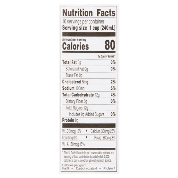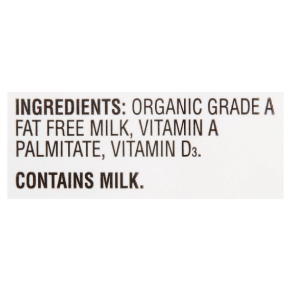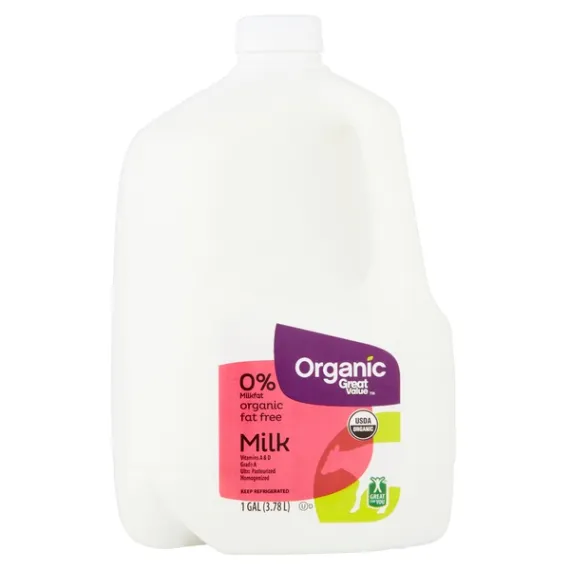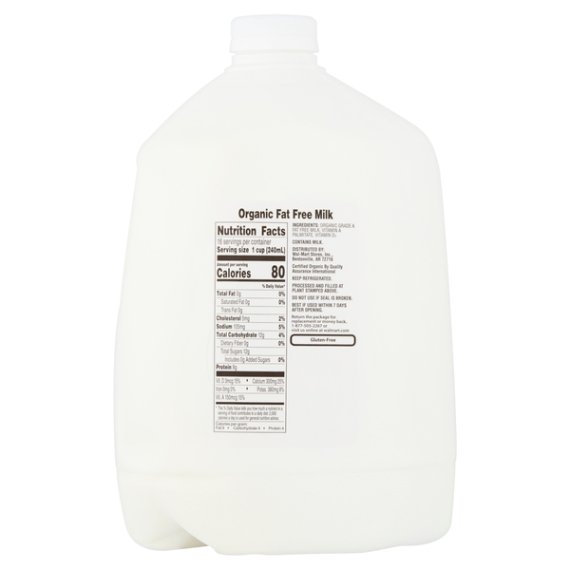 Details Ingredients Organic Grade A Fat Free milk, Vitamin A Palmitate, Vitamin D3 Product features Offer your family a healthy beverage with Great Value Organic Fat Free Milk. Our milk is USDA-certified organic, ultra-pasteurized, gluten-free, and contains zero fat, making this drink a great choice for people who are being careful with their diet. Mix it with fruit to blend into smoothies for a satisfying, nutritious snack that's fast and easy to make, or enjoy a glass with dinner. If you are craving a creamy, nutritious beverage, do your diet and your taste buds a favor with a glass of Great Value Organic Fat Free Milk. Great Value Organic offers a wide-range of USDA certified organic foods that are hand-selected to meet our high standards as well as yours. We use wholesome ingredients without artificial flavors or preservatives to deliver great food you can trust at an affordable price. Fill your table with organic foods your family deserves without draining your budget. Organic fat free milk Gluten-free and USDA organic certified 80 calories per serving Vitamin A and D, grade A, ultra-pasteurized, homogenized 1 gallon (3.78L) “Great For You” label designation Net Quantity of Content 16 X 1 Cup, 240 mL