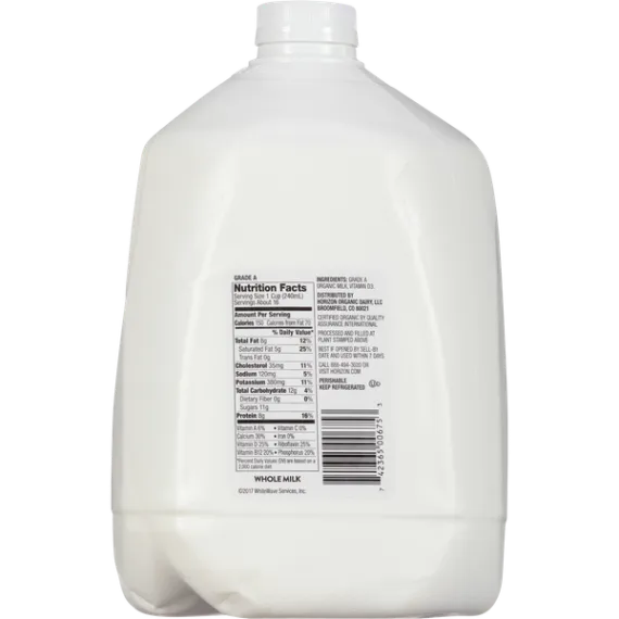 Details Ingredients Grade A Organic Milk, Vitamin D3 Product features Enjoy cold, creamy Horizon Organic milk in a gallon size - that means fewer trips to the store and more time treating your family to the goodness of organic. And since our milk is certified organic, that means: no GMOs, no antibiotics, no added hormones,* no persistent pesticides and the humane treatment of cows. *No significant difference has been shown between milk from rBST-treated & non-rBST-treated cows. Horizon Organic Whole Milk, 1 Gallon: USDA Organic 8G Protein Whole Milk Vitamin D Net Quantity of Content ABOUT 16 X 1 cup