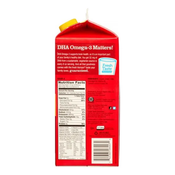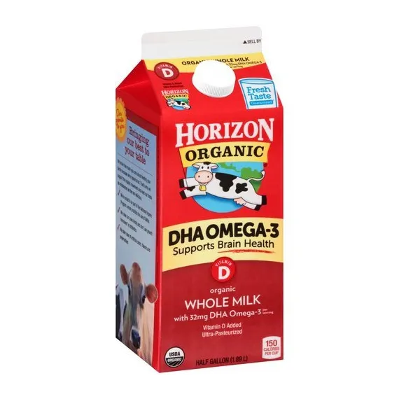 Details Ingredients Organic Grade A Milk, DHA Algal Oil*, Vitamin D3. Product features Calling all busy families! We've got you covered with good foods kids love. Count on Horizon Organic Vitamin D DHA Omega-3 Whole Organic Milk 64oz. as part of a get-em-ready breakfast, A quick-and-easy dinner and the lunchbox in between. We always do our best to choose simple, Recognizable ingredients so you can feel great about bringing us home. Bringing our best to your table. We know how much you care about feeding your family because we're parents too. That's why we support the organic movement and keep our foods as wholesome as they are delicious. We're proud to be part of the National organic Program, which prohibits the use of GMOs. We raise our cows kindly and don't use growth hormones* or antibiotics. Horizon Organic Whole Milk, Half Gallon: USDA Organic 32mg DHA omega-3 per serving Fresh taste Ultra-pasteurized Special Features Grade a ultra-pasteurized Net Quantity of Content 8 X 1 cup